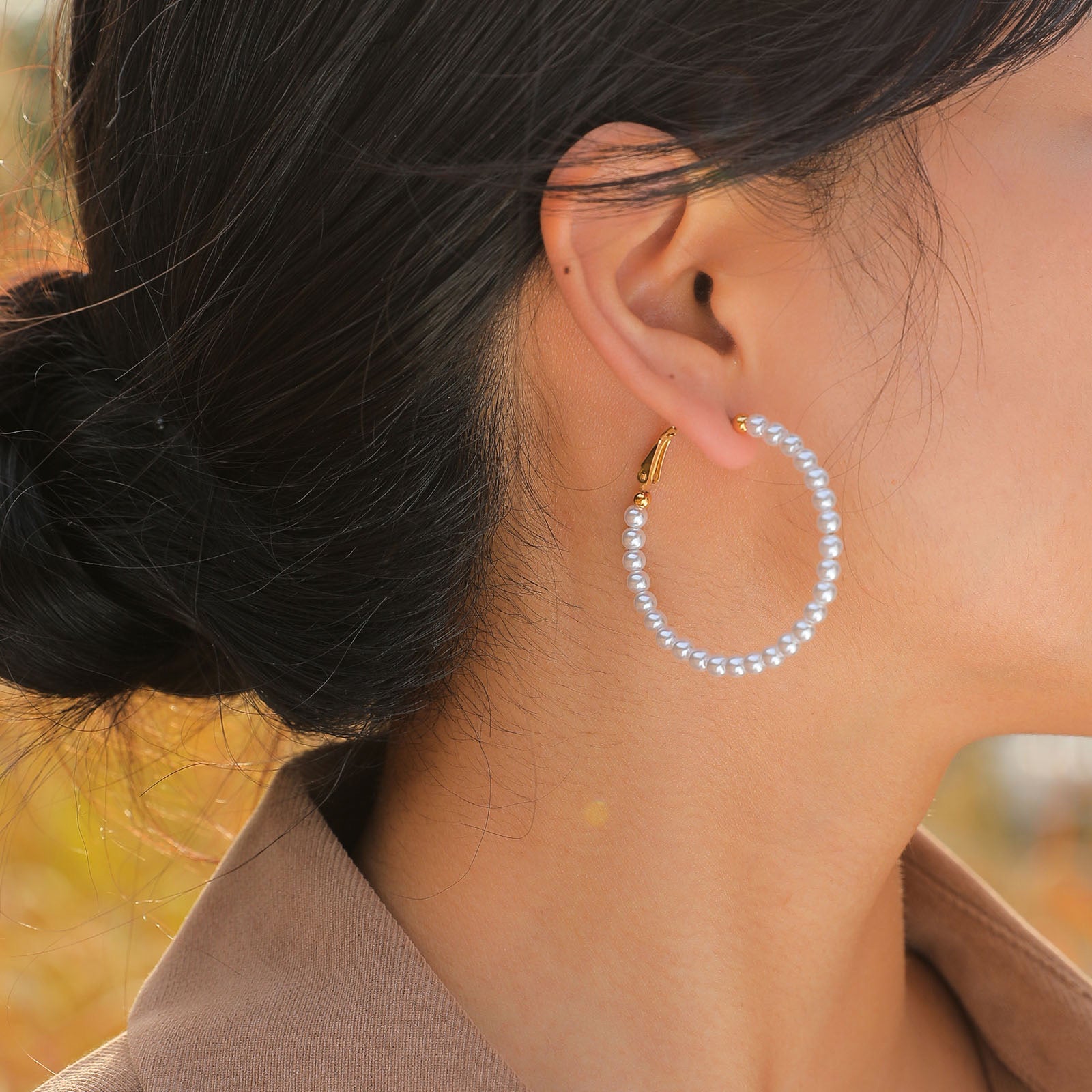 Stainless Steel pierced 1 3/4" gold and small white pearl hoop earrings