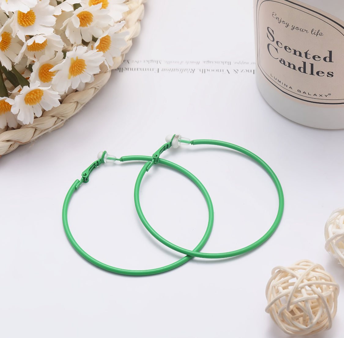 Elevate your style effortlessly with these trendy 2 1/2" clip-on green thin wire hoop earrings. Lightweight and easy to wear, they offer a chic, minimalist look perfect for any occasion without the need for pierced ears. Their sleek design adds a modern edge, making them an ideal accessory to complement both casual and dressy outfits. Experience the perfect blend of comfort and fashion with these versatile hoops.