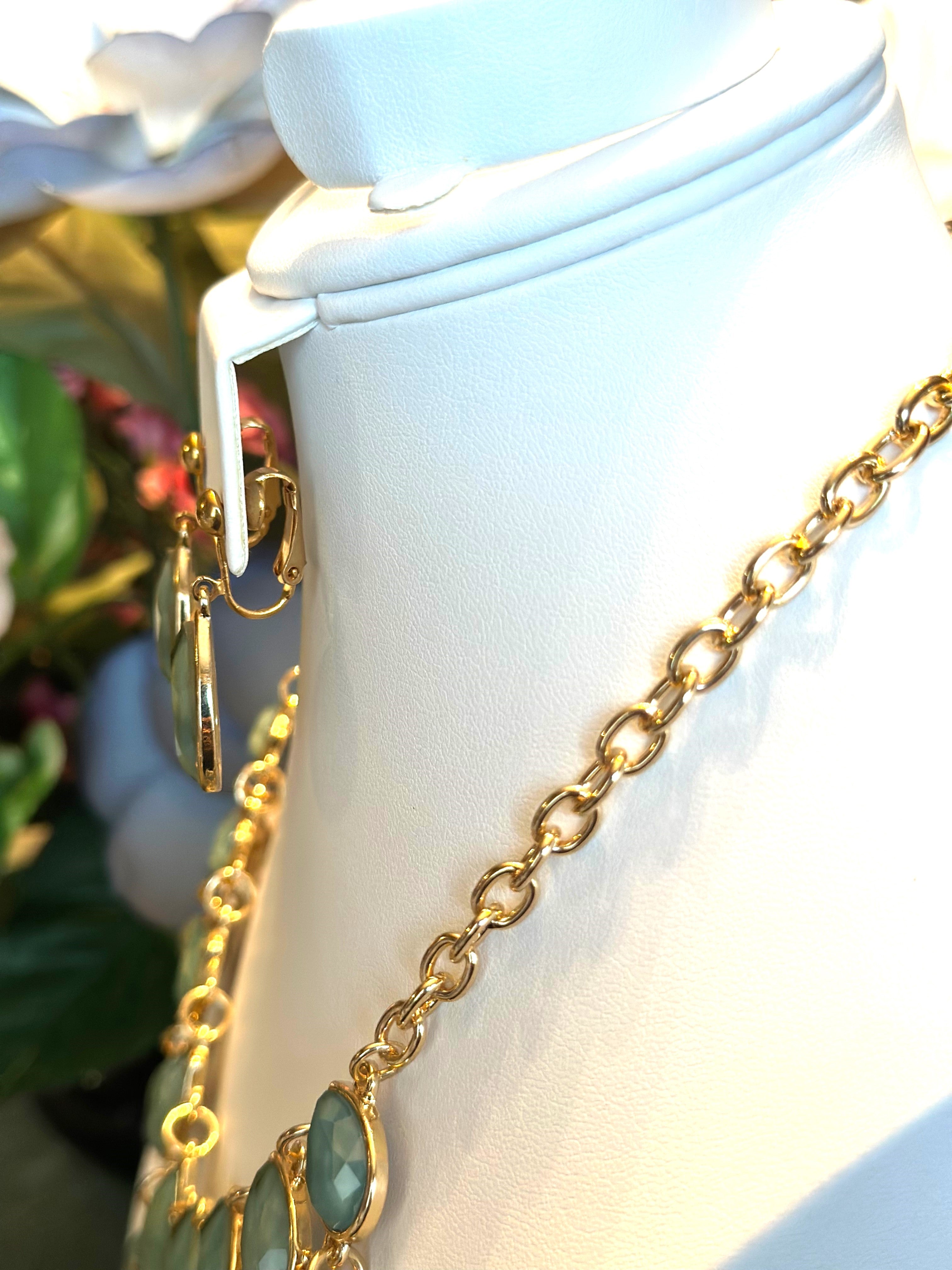 Clip on gold chain and blue teardrop stone statement necklace and earring set