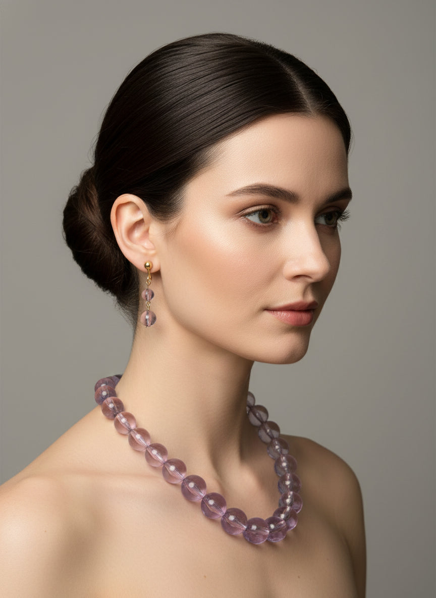 Make a bold statement with this stunning clip-on jewelry set featuring oversized purple beads paired with gleaming gold accents and sparkling clear crystals. The coordinated necklace and earring combination offers effortless elegance without commitment—simply clip on for instant glamour that complements any outfit. Perfect for those who love dramatic, eye-catching pieces that deliver luxury appeal without piercing.