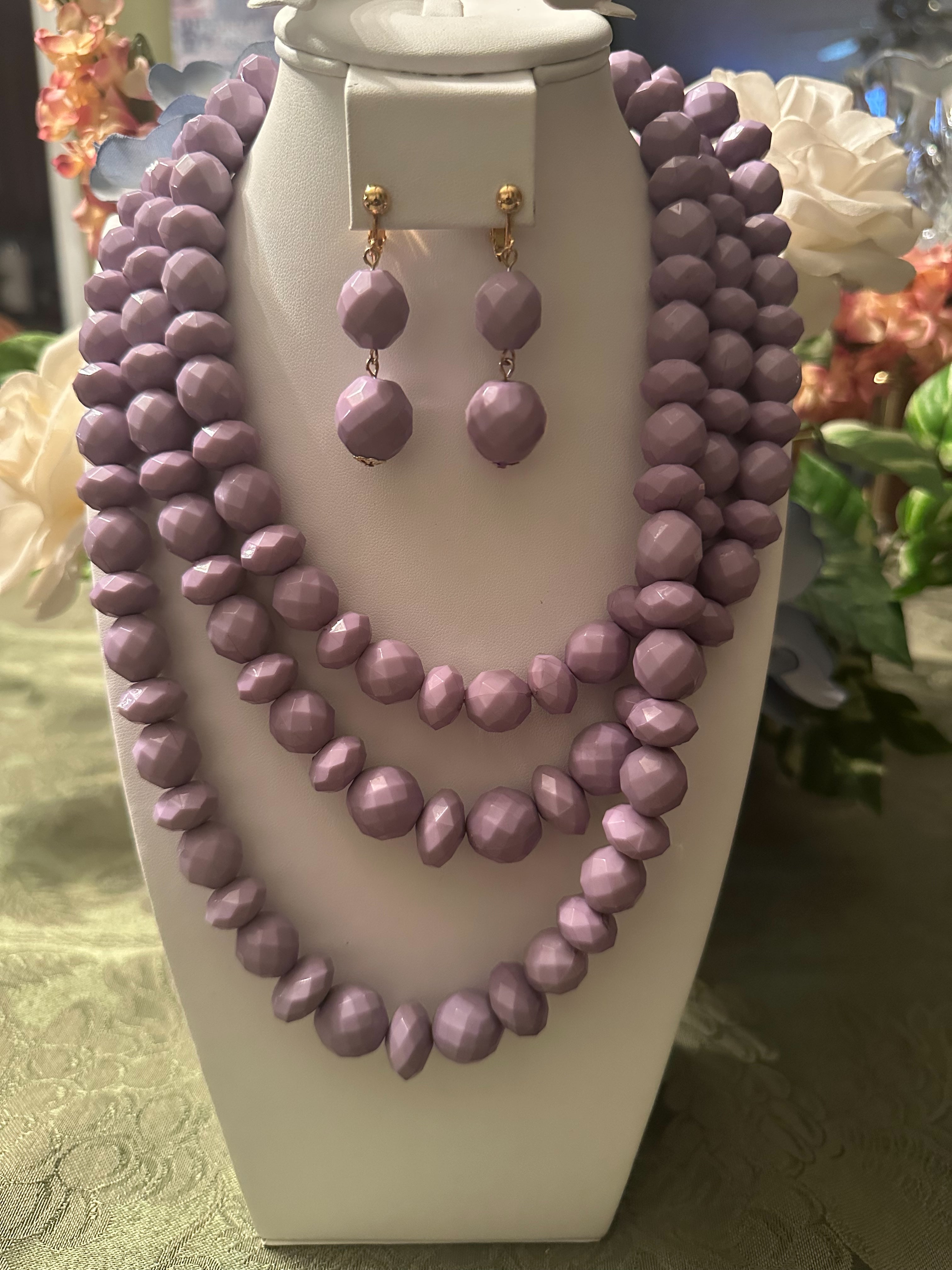 Clip on gold and square cut multi strand lavender-purple necklace set