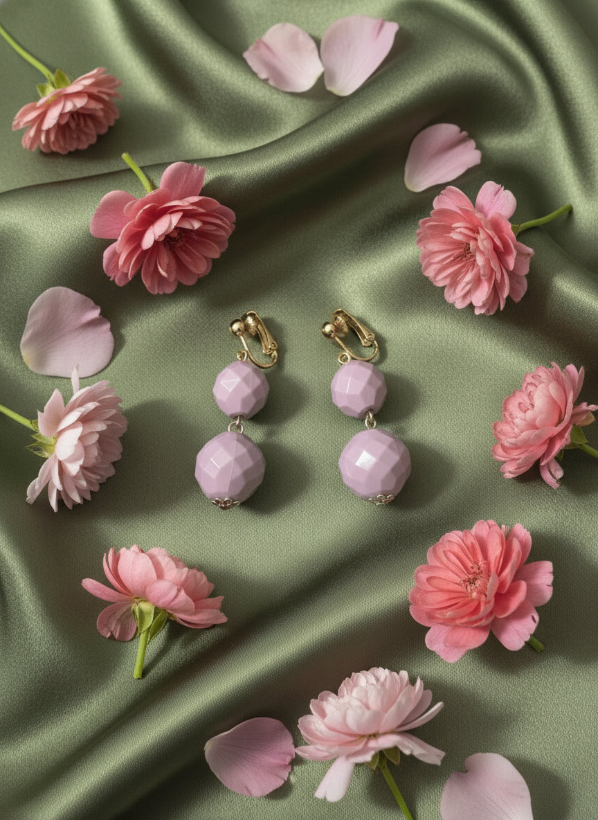Elevate your accessory game with this stunning clip-on set featuring geometric square-cut lavender-purple beads that catch the light beautifully. The multi-strand design creates dimension and movement, while the warm gold tone adds timeless sophistication to any outfit. Perfect for those who love statement jewelry without commitment—clip on in seconds and transform your look instantly.