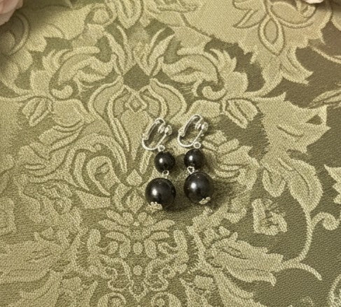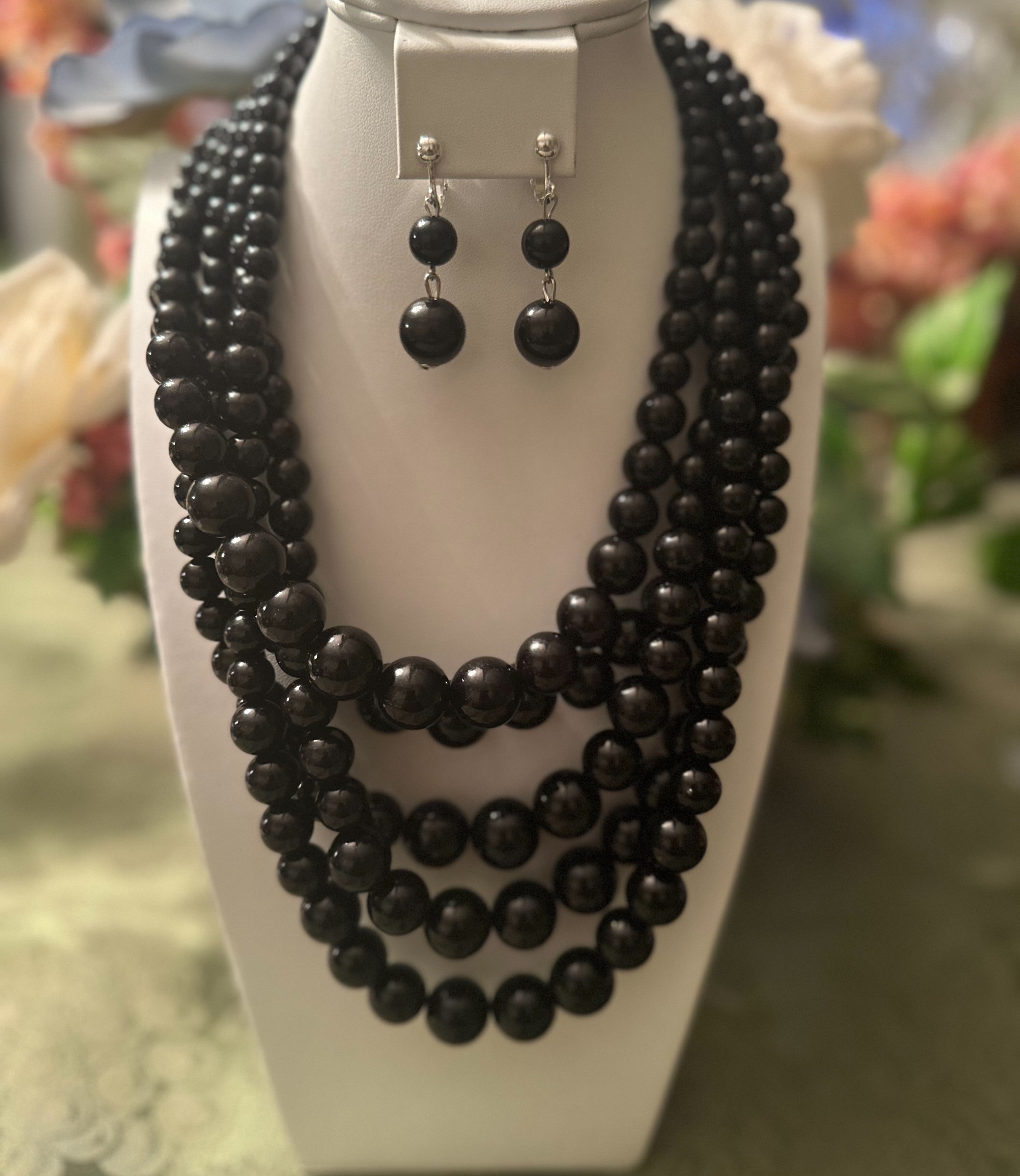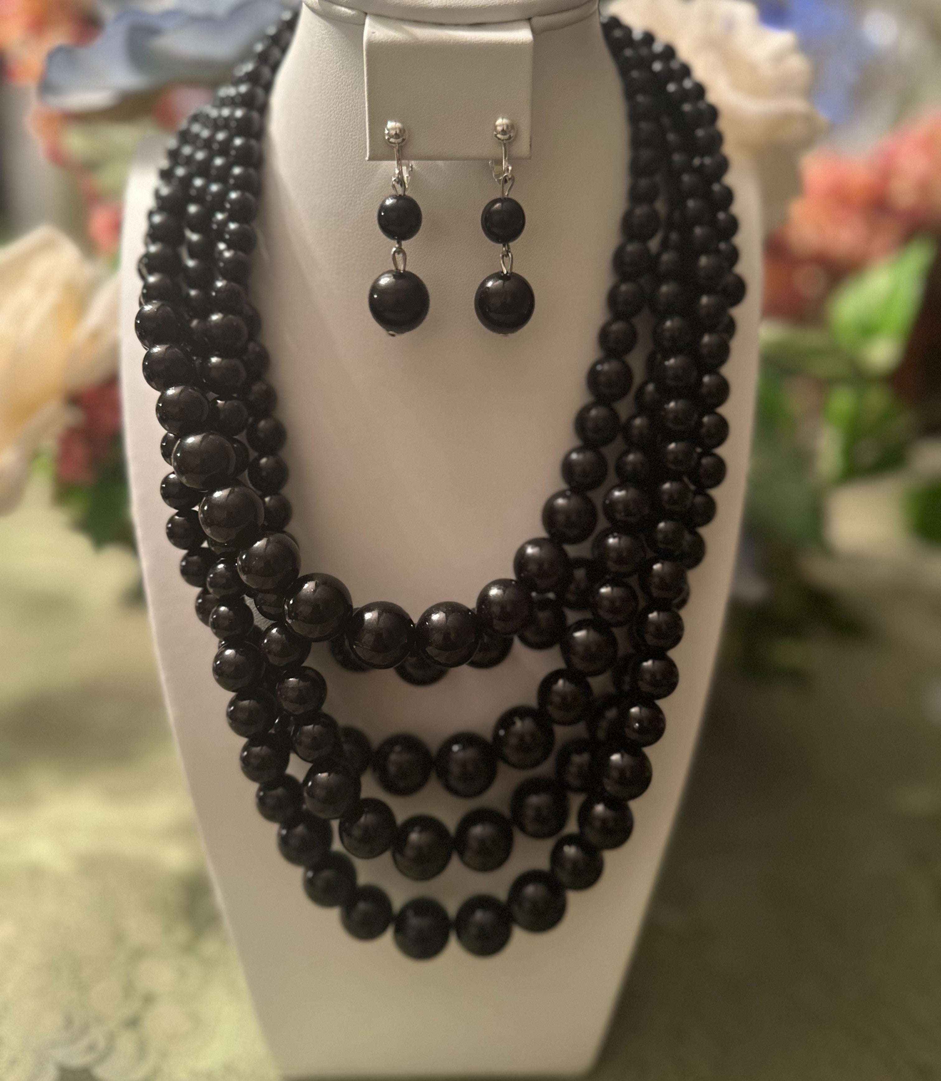 Clip on silver and black bead multi strand necklace and earring set