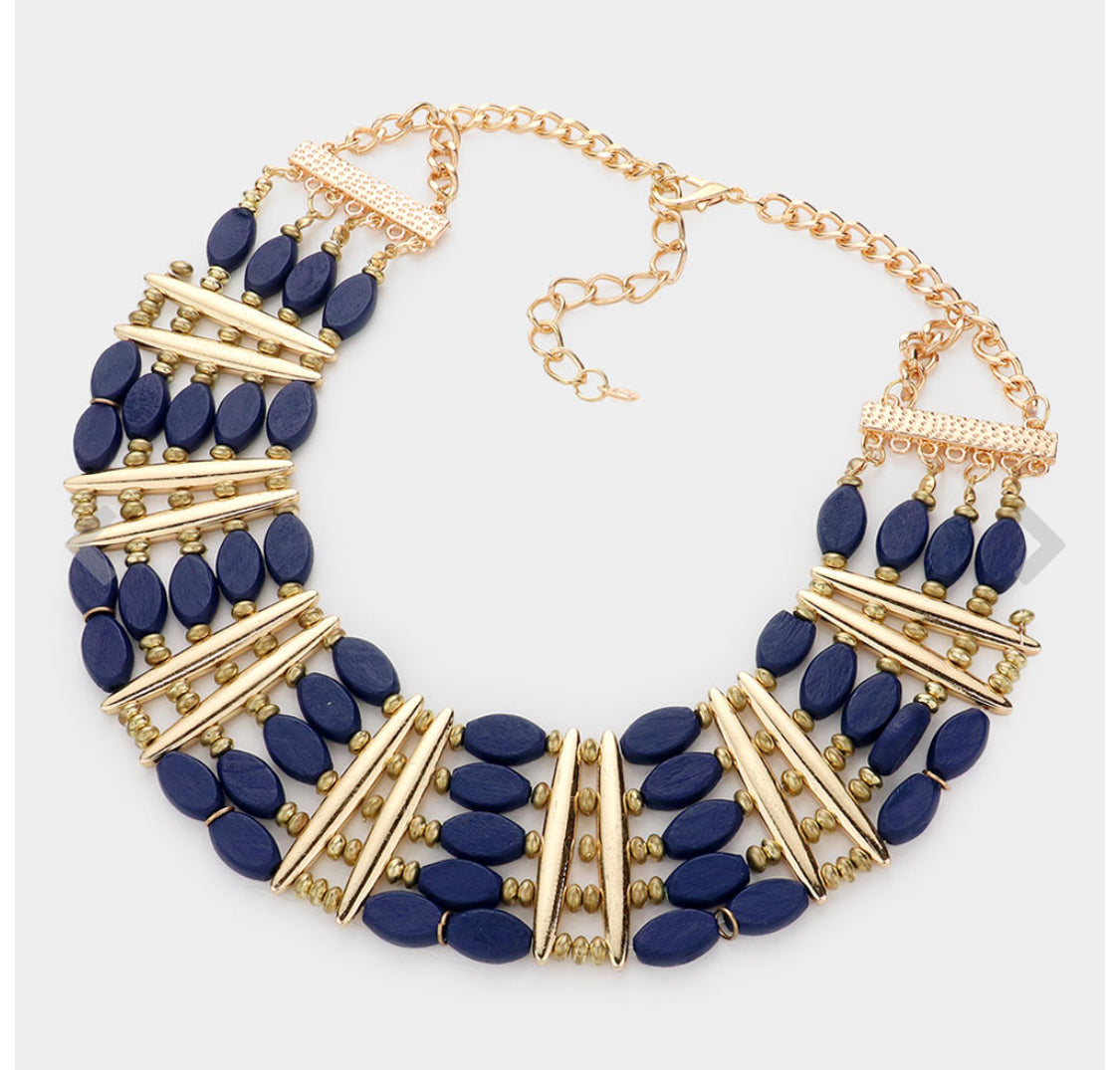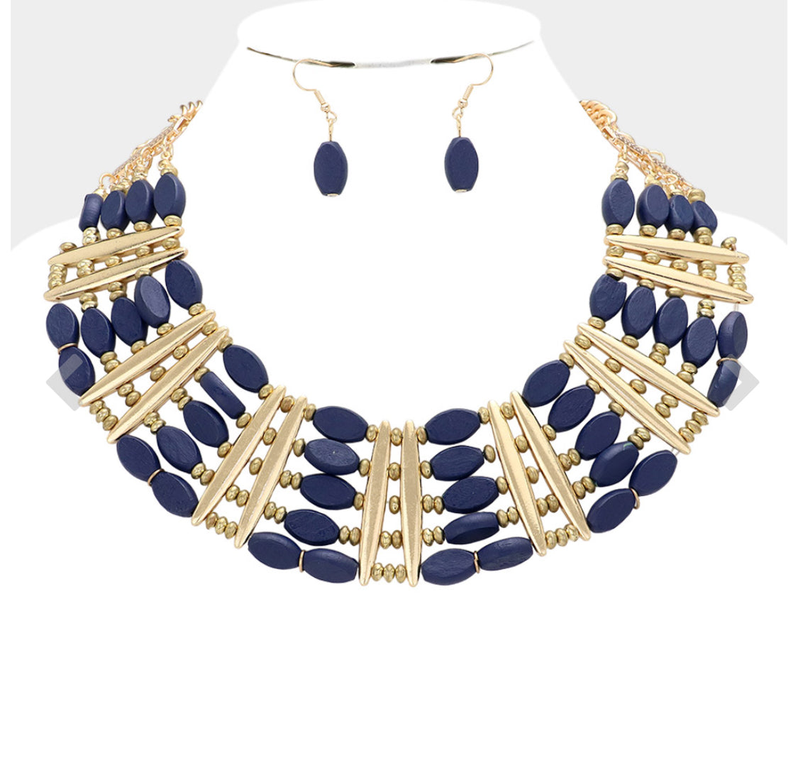 Elevate your style with this stunning 2" wide necklace and earring set featuring pierced gold chain detailing and rich blue wood elements. The perfect statement piece to transform any outfit from ordinary to extraordinary. Designed to catch the eye and spark conversations, this set adds a touch of artisanal luxury to your jewelry collection.