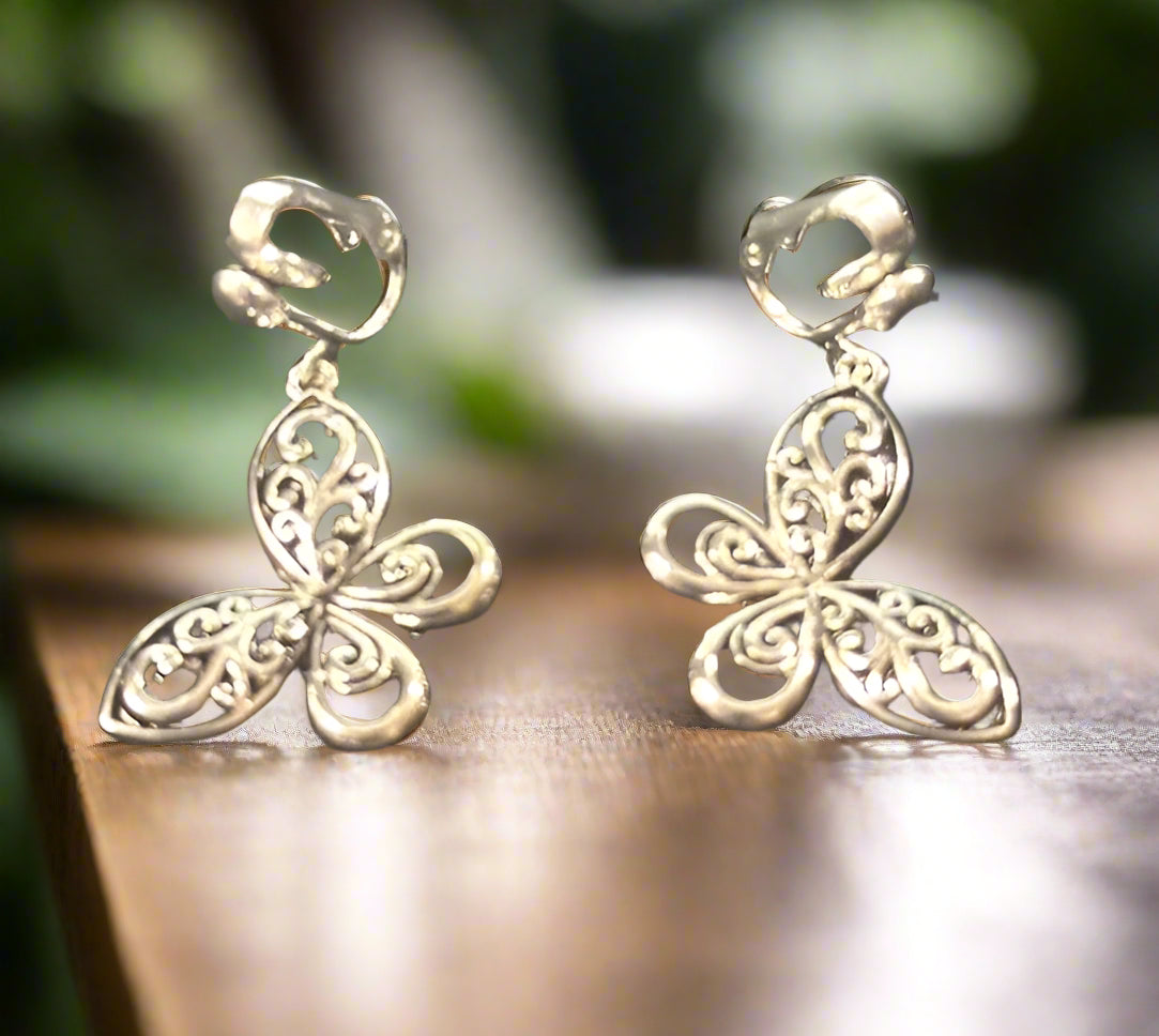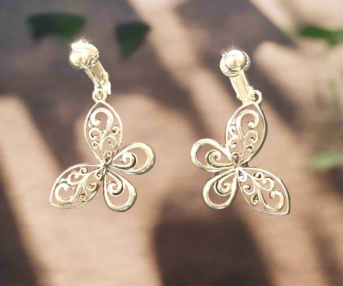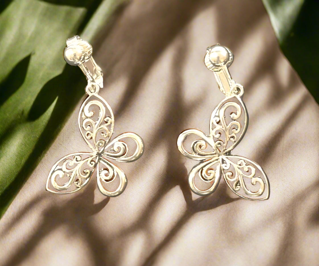Clip on 1 1/2" silver and black cutout dangle butterfly earrings