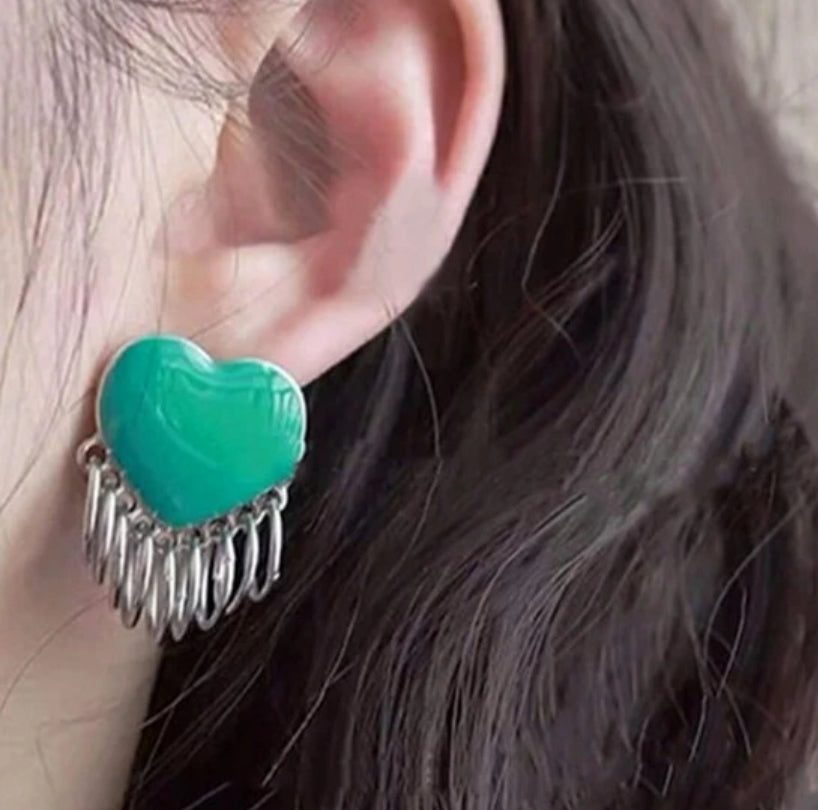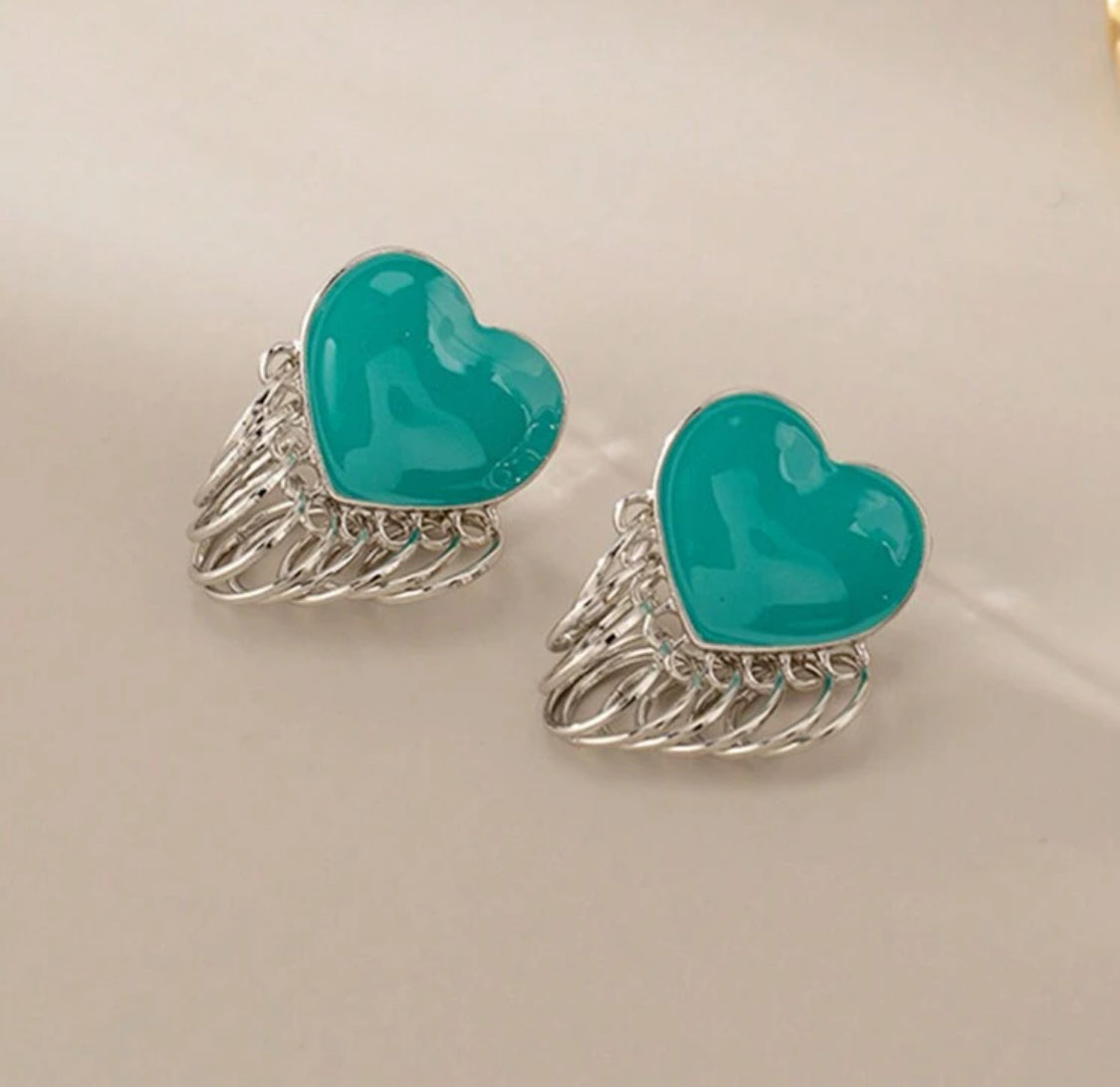 These clip-on earrings feature a 1 1/4" silver heart accented with vibrant turquoise, paired with elegant dangle multi rings. Designed for comfort, they offer a secure fit without the need for pierced ears, making them perfect for all-day wear. Add a touch of stylish charm and effortless sophistication to any outfit with these versatile earrings.