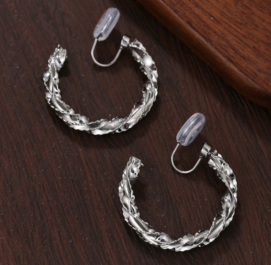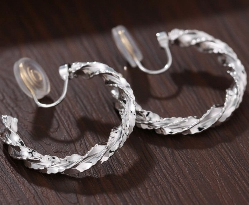 Clip on 1 1/4" comfort fit silver sparkle twisted hoop earrings
