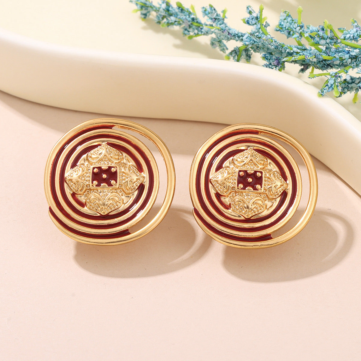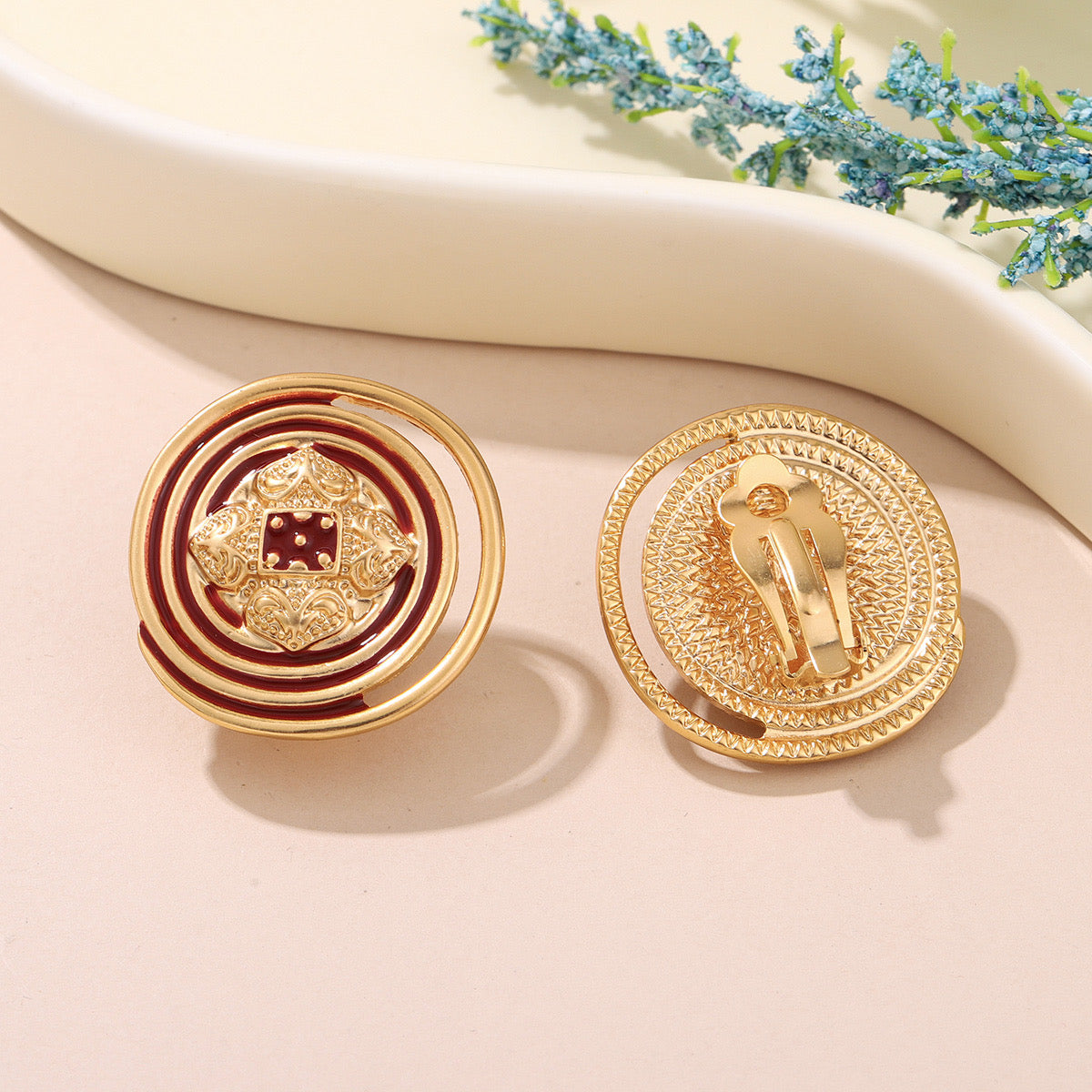 Clip on 1 1/4" gold and red indented cutout circle earrings