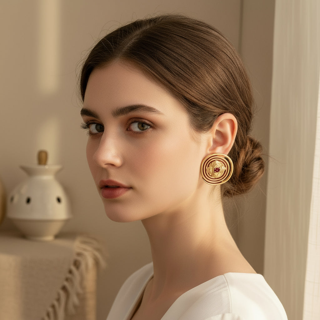Make a bold statement with these striking clip-on earrings featuring a 1 1/4" gold and red design. The indented cutout circle creates eye-catching dimension and modern appeal, while the secure clip-on mechanism ensures all-day comfort without piercing. Perfect for adding instant glamour to any outfit, these versatile pieces transition seamlessly from casual to elegant occasions.