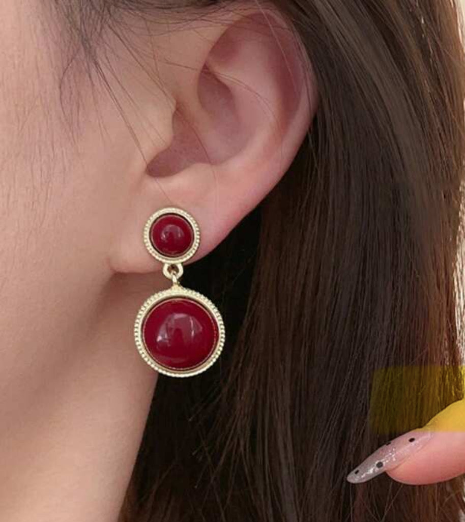 Elevate your style effortlessly with these clip-on double circle dangle earrings. Featuring a striking 1 1/4" design in gold accented by vibrant red stones, they add a touch of elegance without the need for pierced ears. Perfect for any occasion, these earrings combine bold color and graceful movement to enhance your look with ease and comfort.