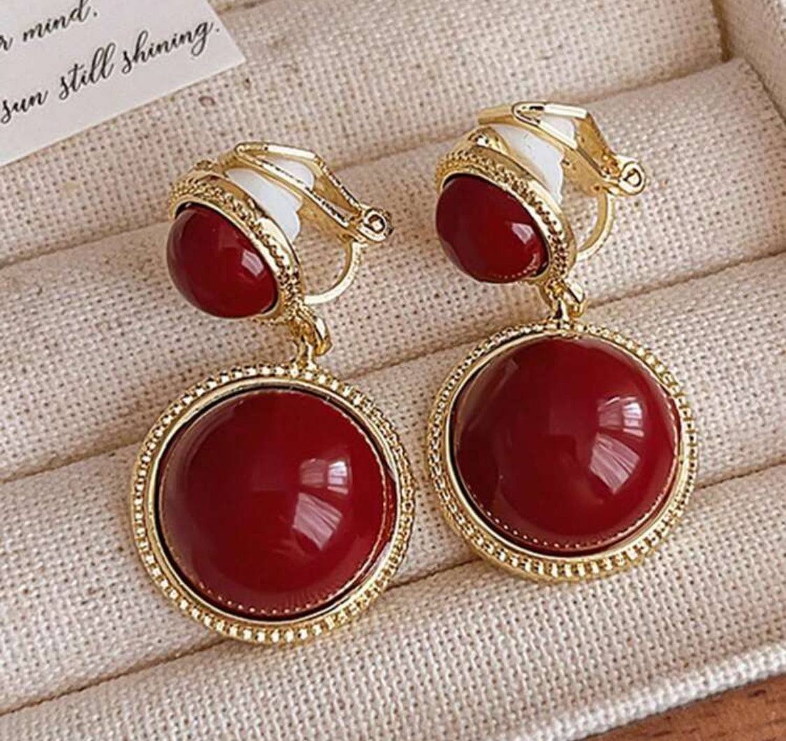 Clip on 1 1/4" gold and red stone double circle dangle earrings