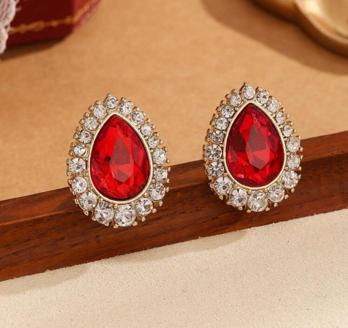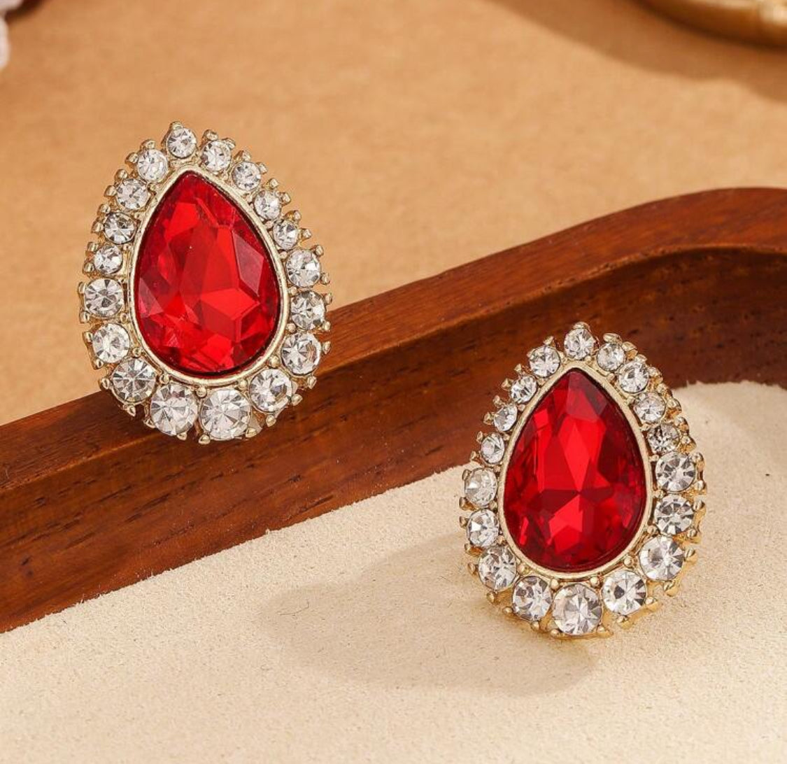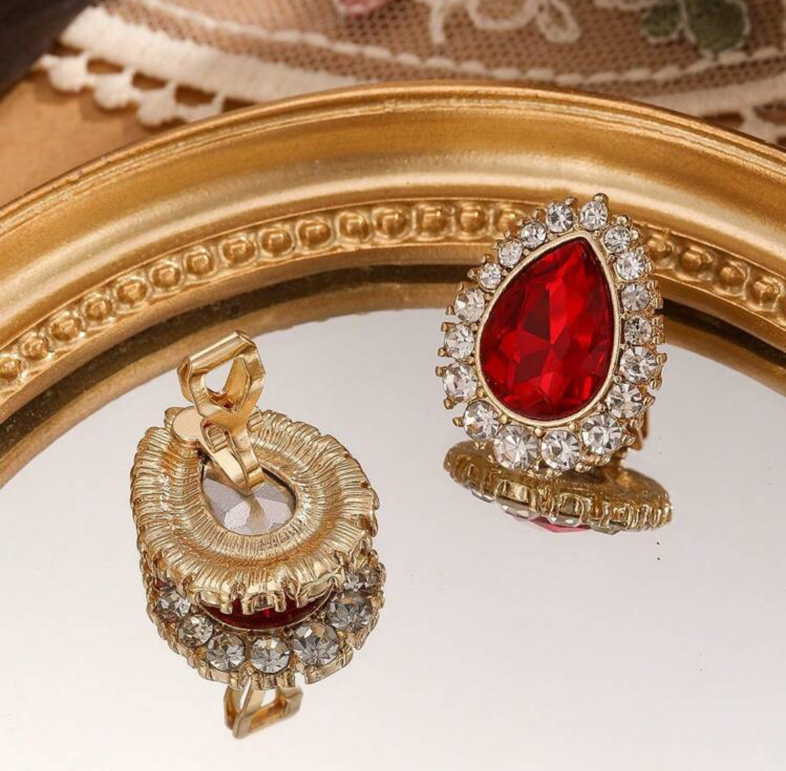 Clip on 1 1/4" gold, red and clear stone teardrop earrings