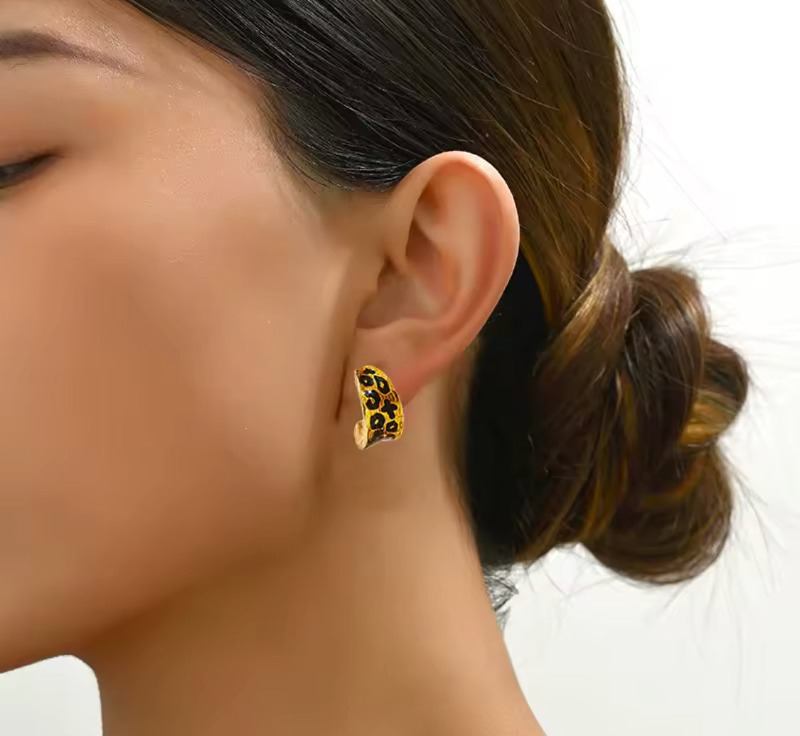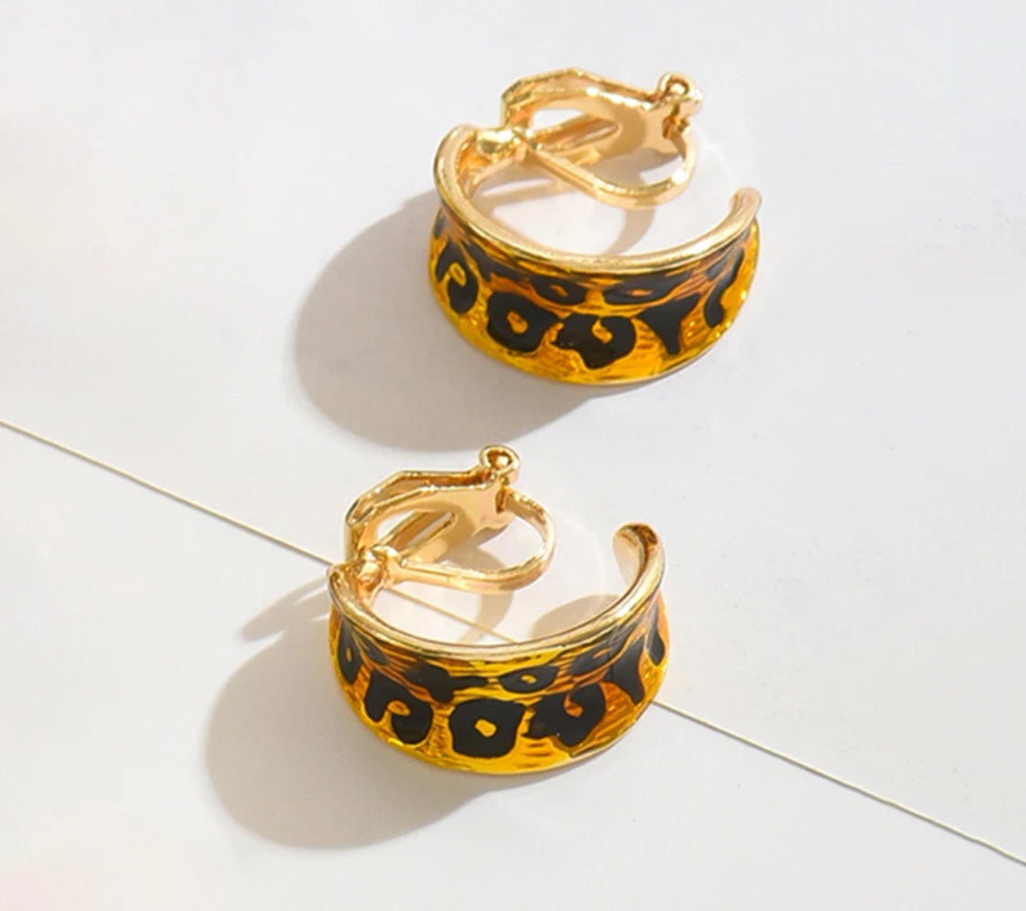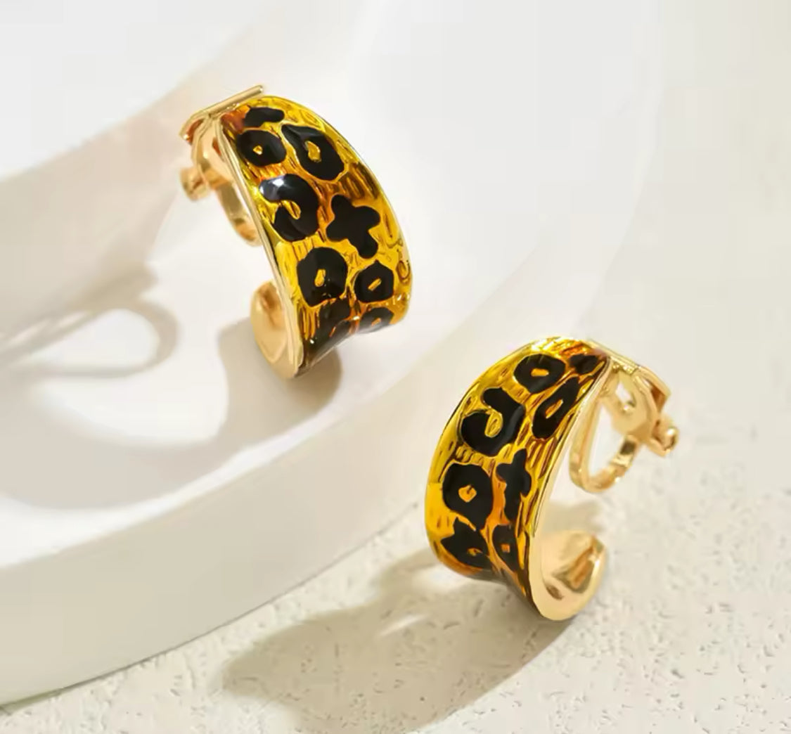 Clip on 1/2" small gold and black animal print bent earrings