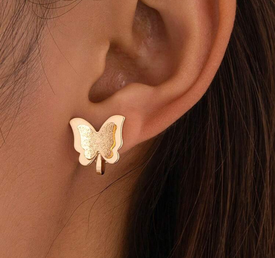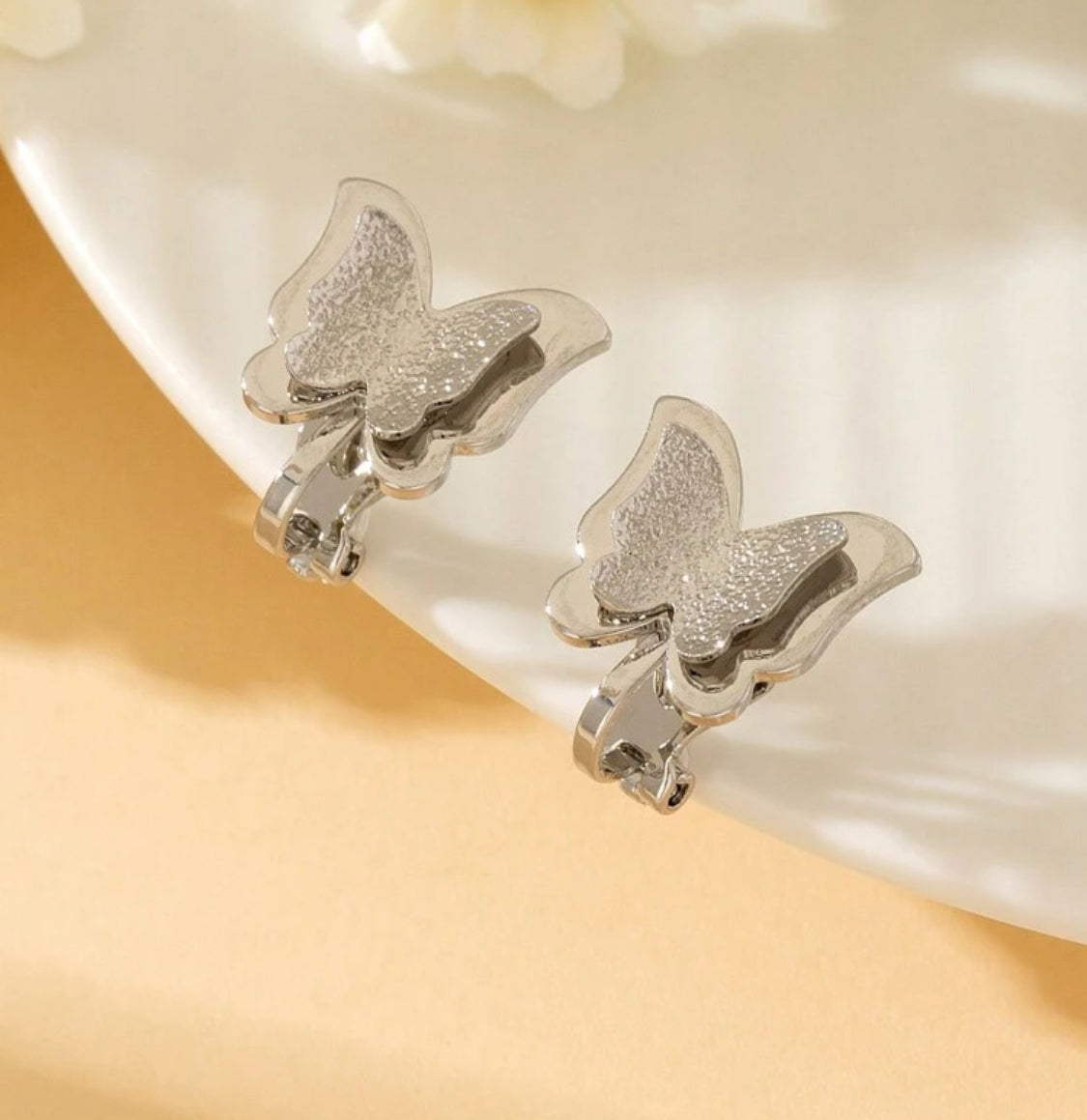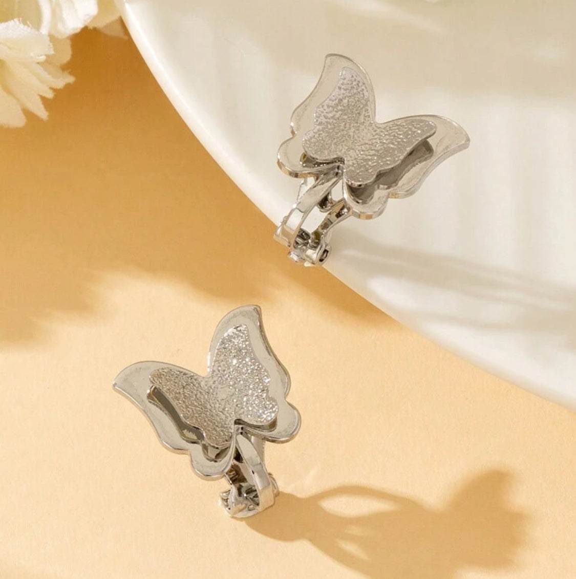 These delicate 1/2" clip-on silver earrings feature a charming double butterfly design, perfect for adding a subtle touch of elegance without the need for pierced ears. Lightweight and comfortable, they offer a stylish way to enhance any outfit effortlessly. Ideal for everyday wear or special occasions, these button-style earrings combine beauty and convenience in one graceful accessory.