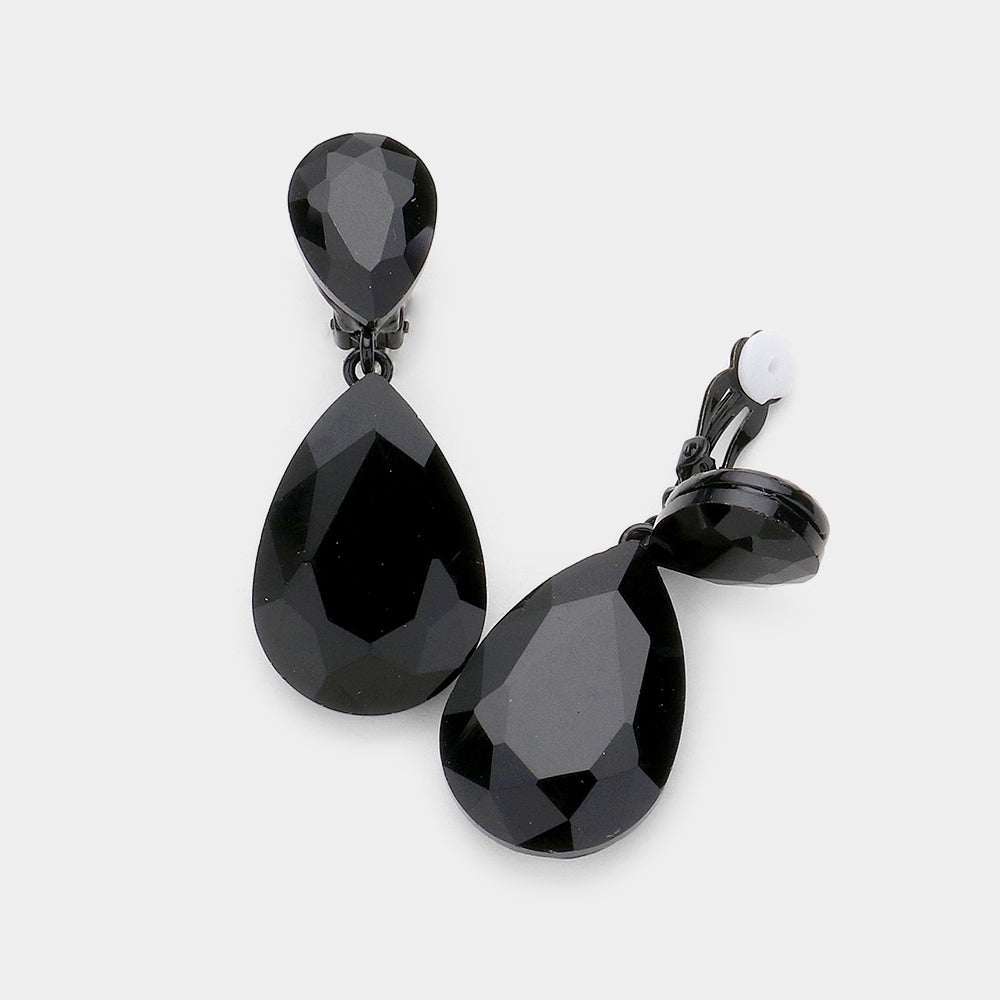 Experience classic, timeless elegance with these black stone double teardrop dangle 1 3/4" clip on earrings. Crafted with luxurious materials, these clip-on earrings are a sophisticated fashion statement. A timeless style that harkens back to the golden age of glamour, these earrings will turn heads.