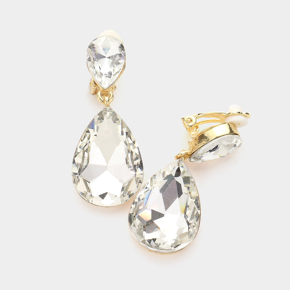 Elevate any look with these luxe 1 3/4" clip on earrings. Crafted from gleaming gold and luminous clear stones, these exquisite teardrop dangle earrings will add a timeless touch of sophistication to any look.
