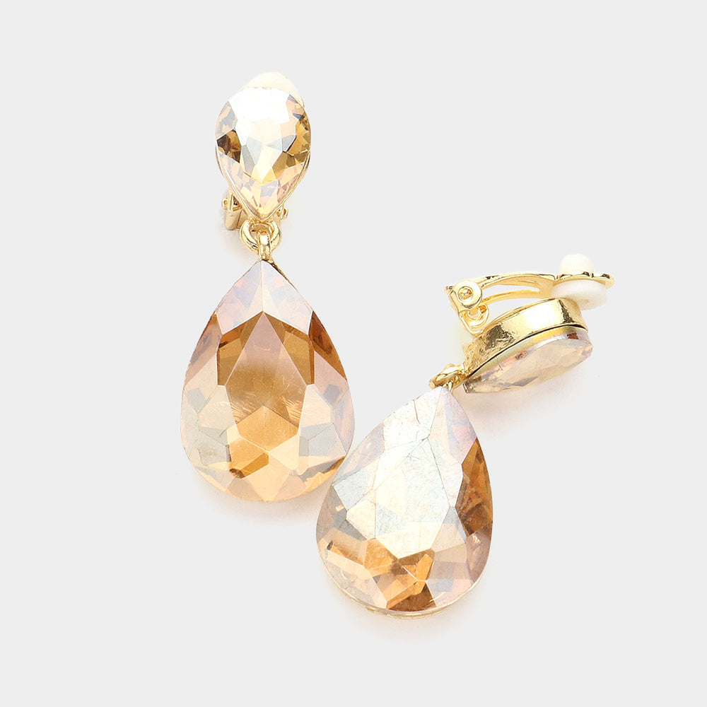 Elevate your look with these luxurious 1 3/4" clip-on earrings, featuring glimmering gold frames and brown stones in a double teardrop shape. A perfect statement piece for your next evening event, they'll add an exquisite and exclusive touch to any outfit.