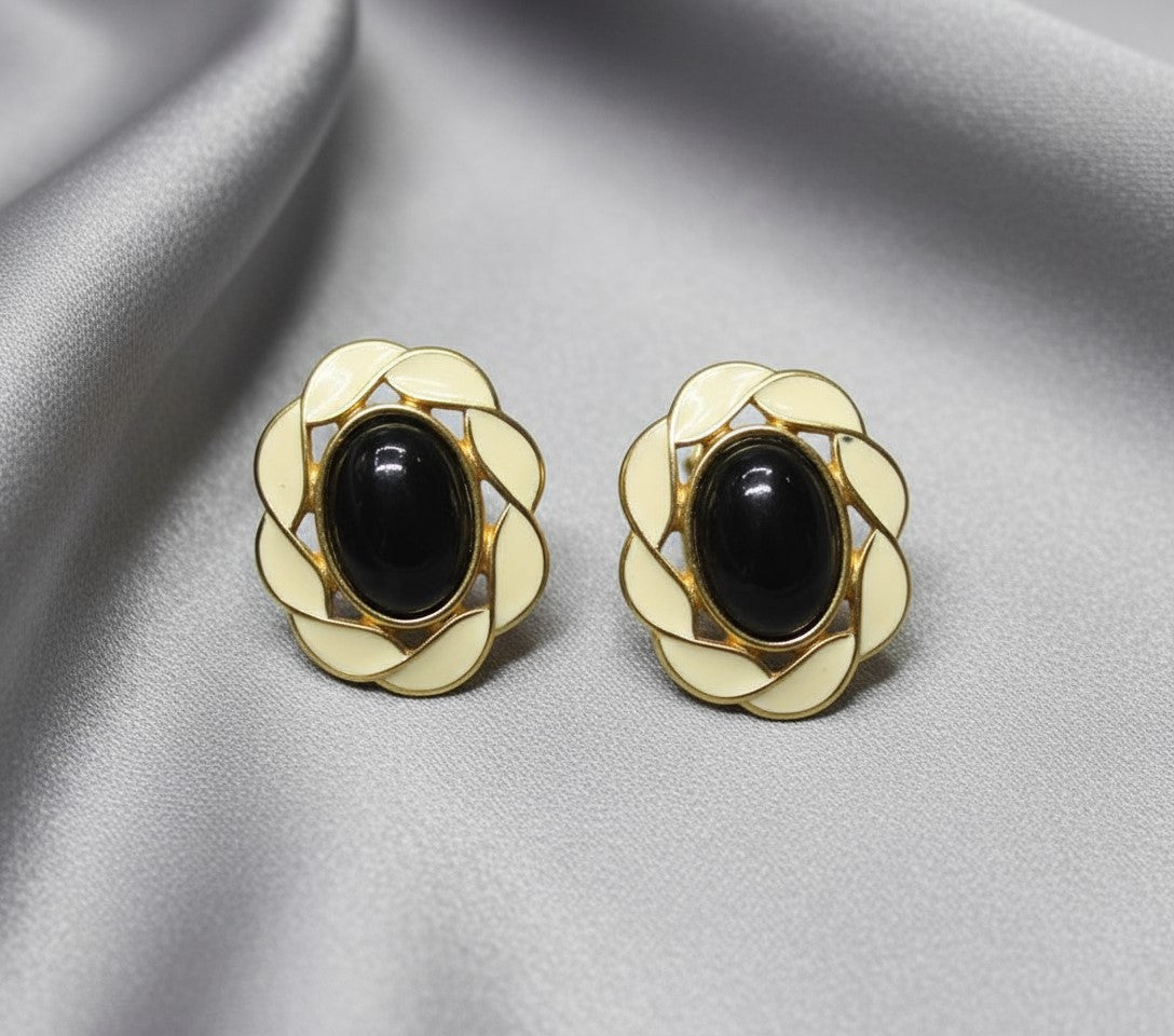 Elevate your accessory game with these stunning screwback clip-on oval earrings featuring a lustrous black center framed by an elegant gold and cream twisted edge design. At 1" in length, they strike the perfect balance between statement-making and wearable sophistication. The secure clip-on mechanism ensures all-day comfort without piercing, making them ideal for sensitive ears or anyone seeking versatile styling options.