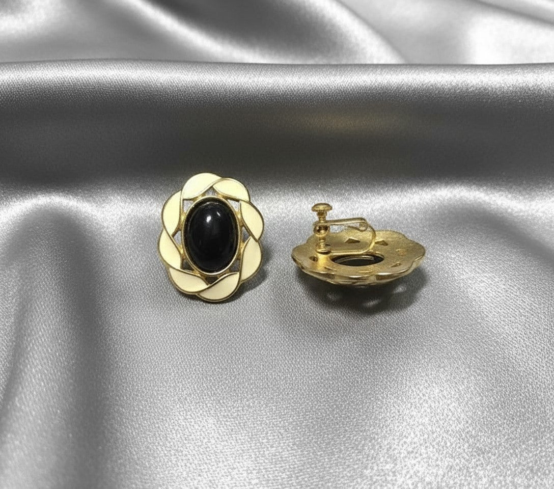 Clip on 1" gold and cream twisted edge black bead oval earrings