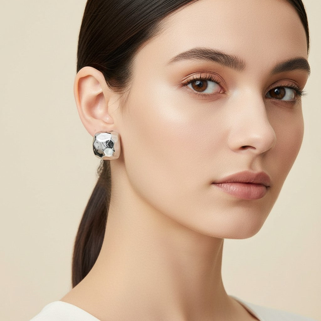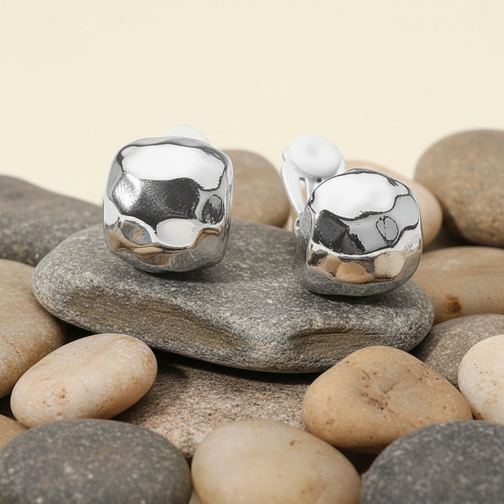 Make a refined statement with these elegant clip-on earrings showcasing a distinctive 1" bent hammered button silhouette in lustrous silver. The artisanal hammered texture creates captivating light play, while the curved design adds modern sophistication to your ensemble. Designed for effortless wear, the secure clip-on mechanism ensures all-day comfort without piercing.