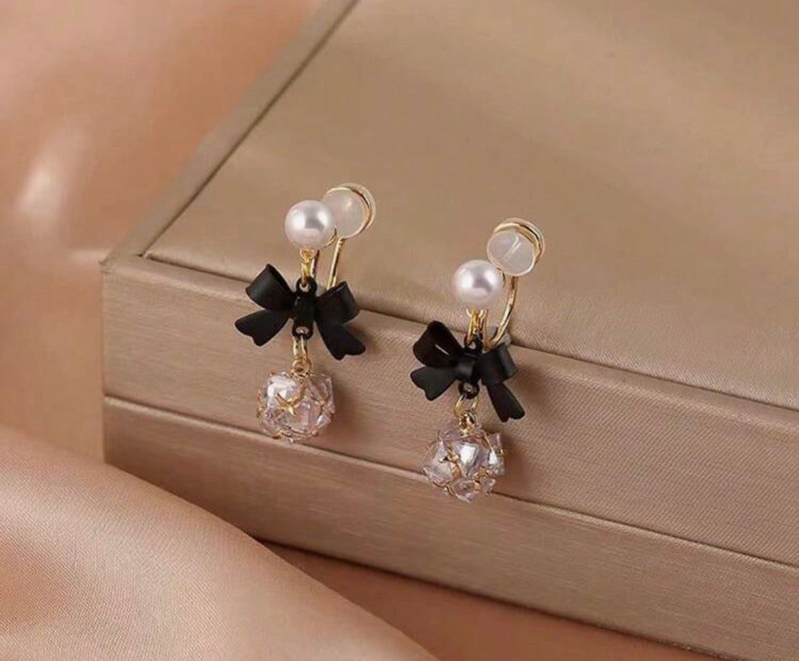 Experience timeless charm with these exquisite clip-on earrings featuring a delicate black bow design adorned with lustrous white pearls and sparkling clear stone balls. At 1 1/4" long, they strike the perfect balance between presence and wearability. The gold pellet backs ensure a secure, comfortable fit while the refined aesthetic works beautifully for weddings, galas, or everyday elegance.