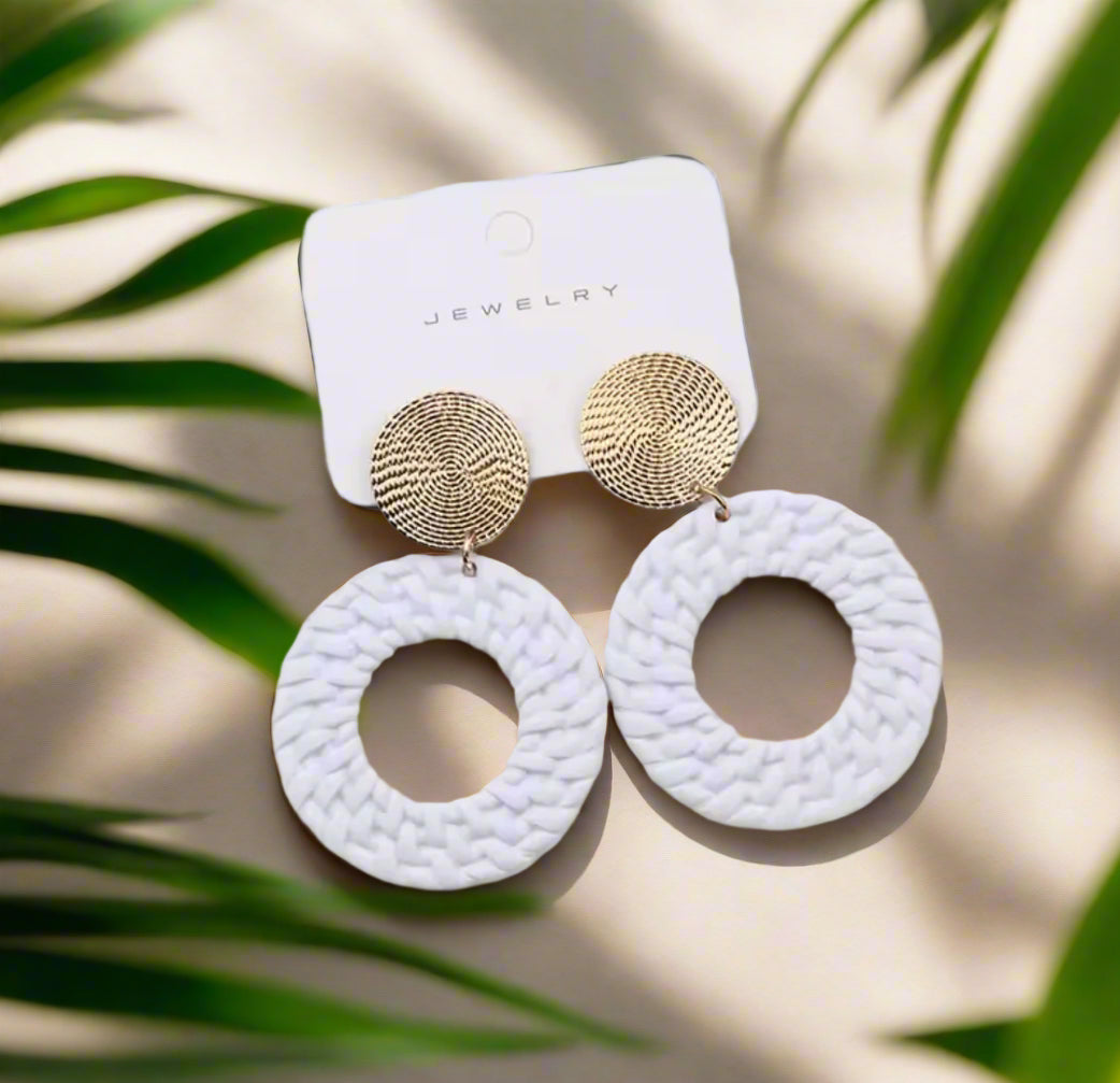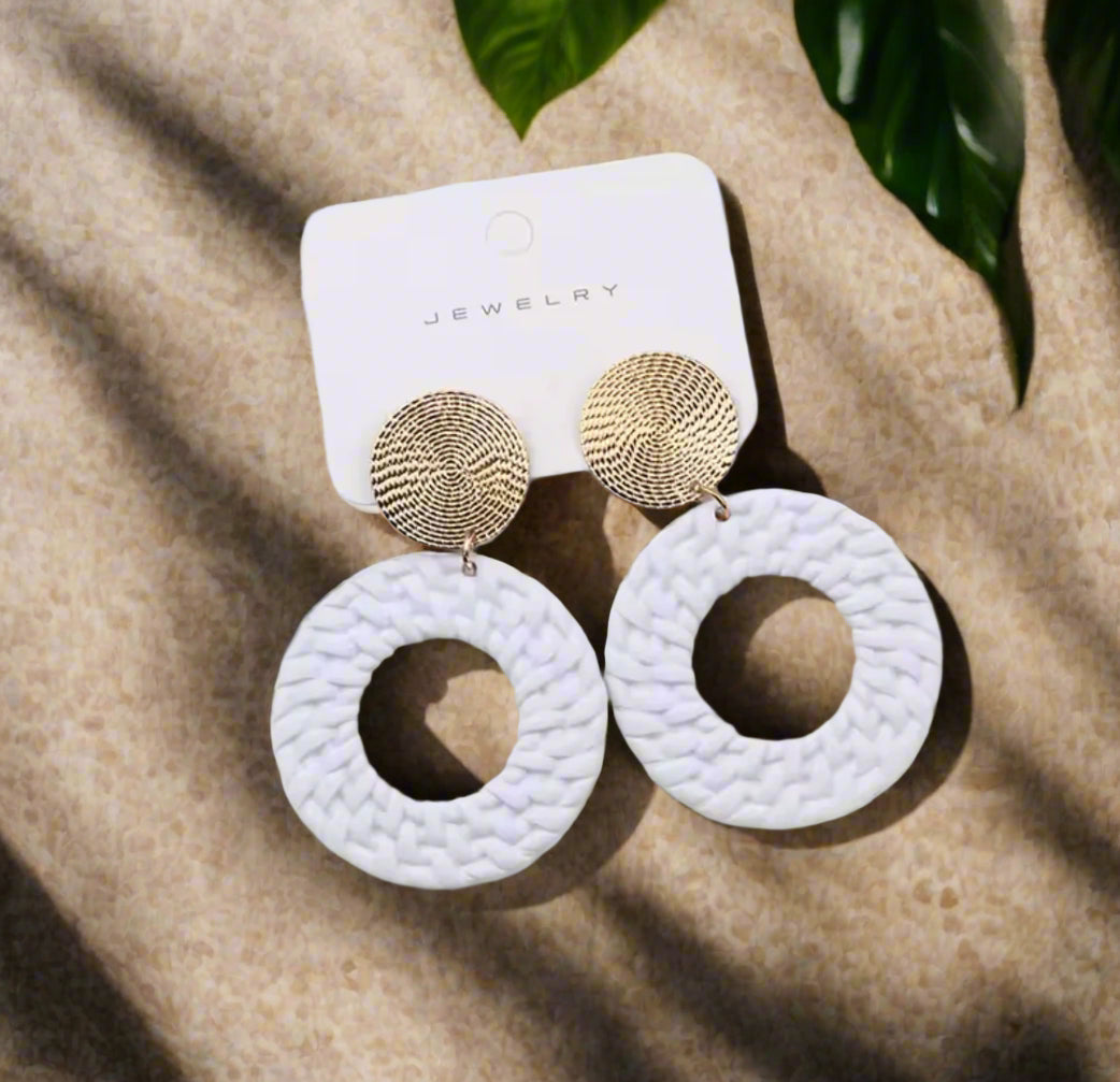 Elevate your style with our beautifully crafted Clip on 2 1/2" round gold top earrings. The elegant white woven hoop adds a touch of sophistication to any outfit. No need for pierced ears, these clip-ons offer comfort and style in one.