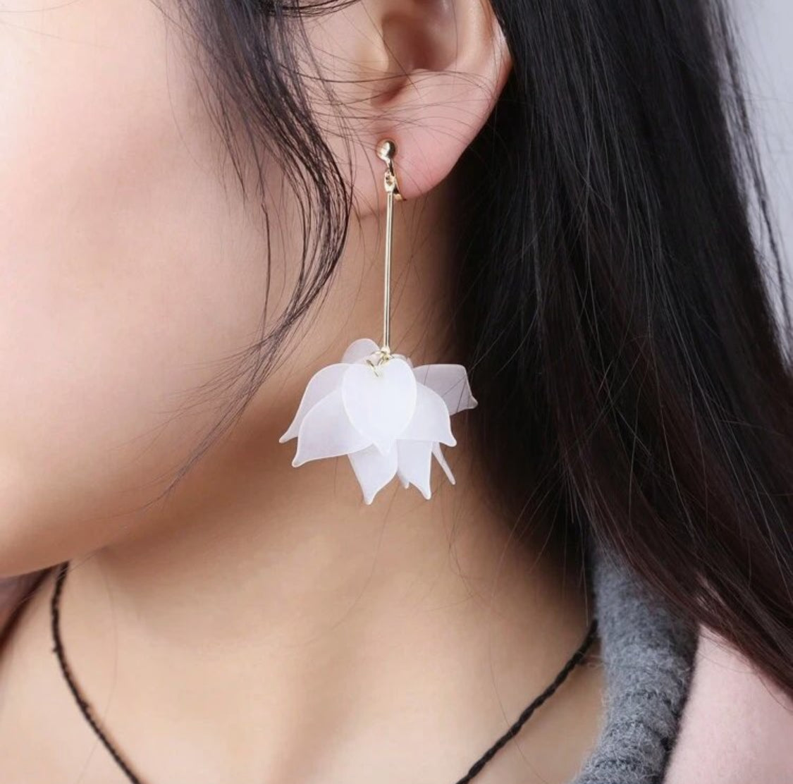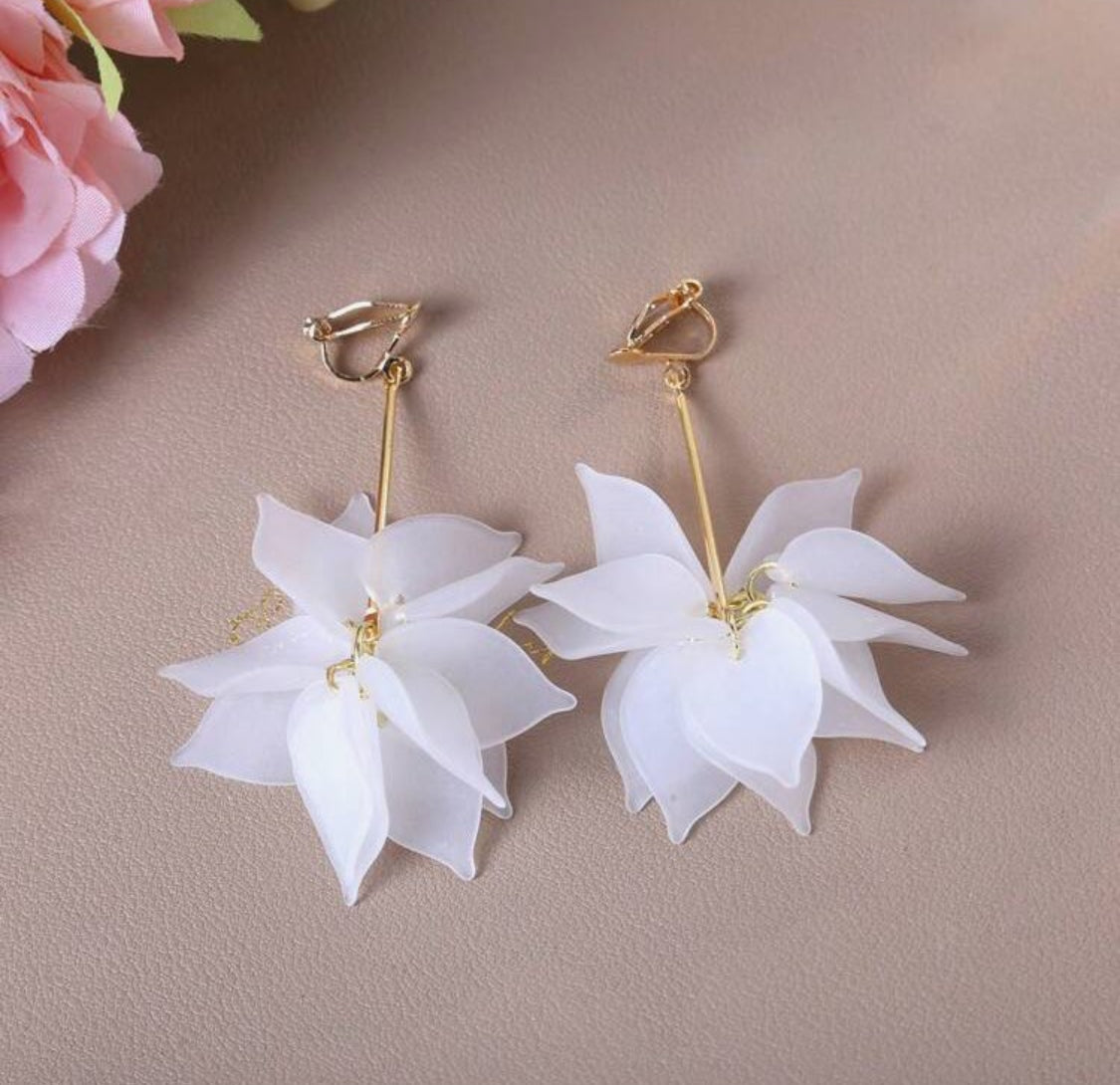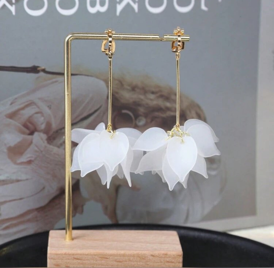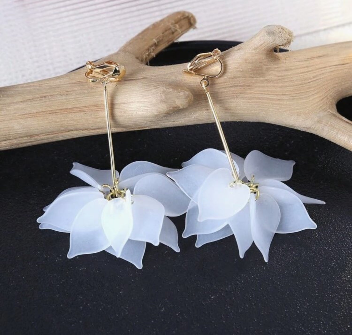 Elevate your style effortlessly with these elegant 2 3/4" clip-on earrings featuring delicate gold wire and striking white pointed flower dangles. Perfect for those without pierced ears, they offer a comfortable fit while adding a touch of sophistication to any outfit. Ideal for both everyday wear and special occasions, these earrings combine classic charm with modern convenience.