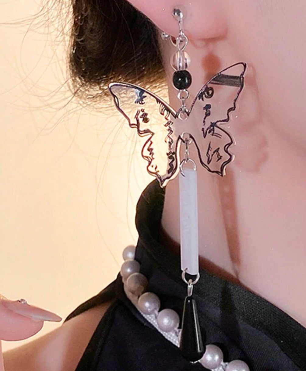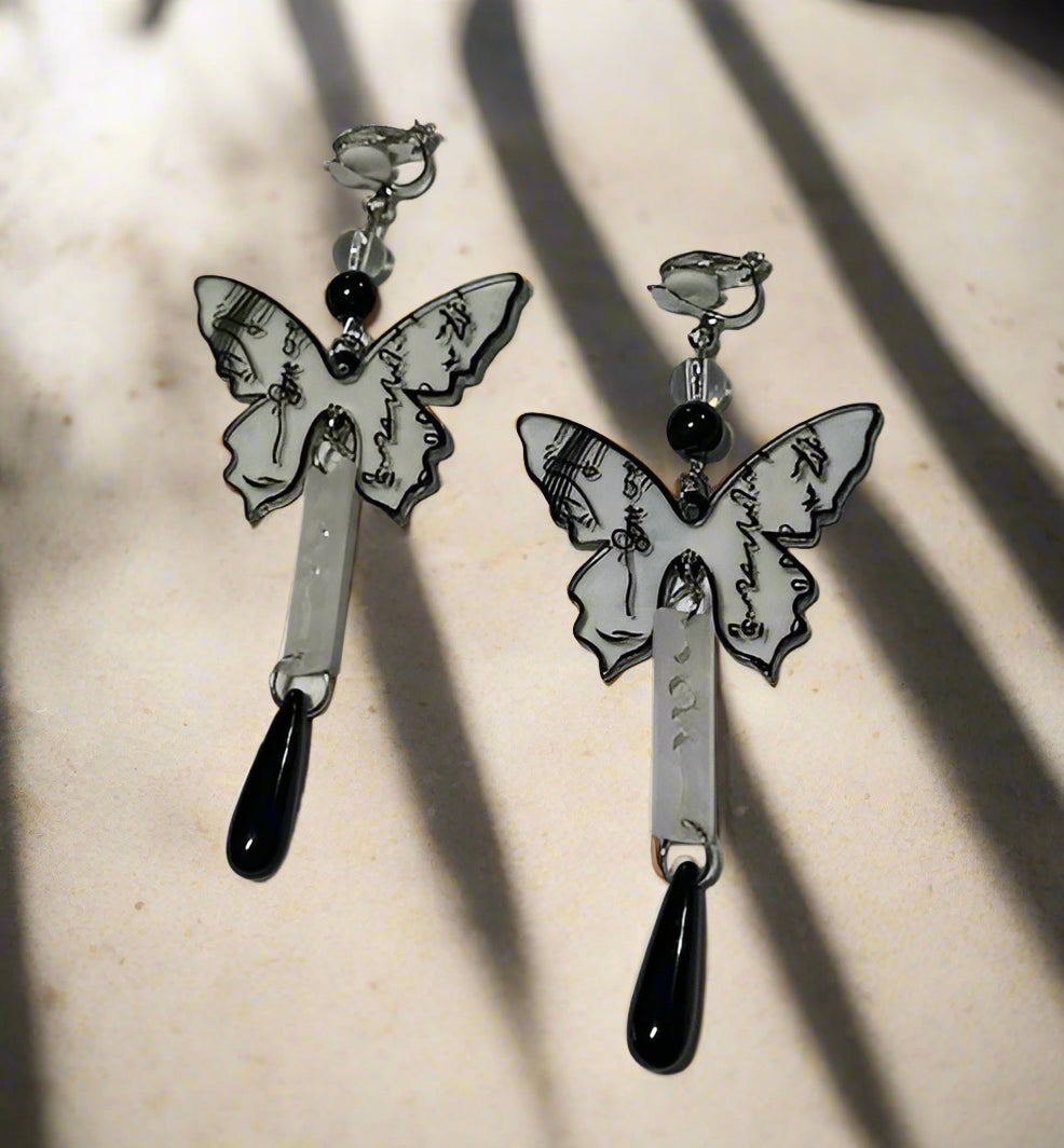 These elegant 3 1/2" clip-on earrings feature a striking clear butterfly design in silver, black, and clear white tones. Their lightweight dangle style offers comfortable wear without the need for pierced ears, making them perfect for adding a touch of sophistication and charm to any outfit. Elevate your look effortlessly with these versatile and eye-catching accessories.