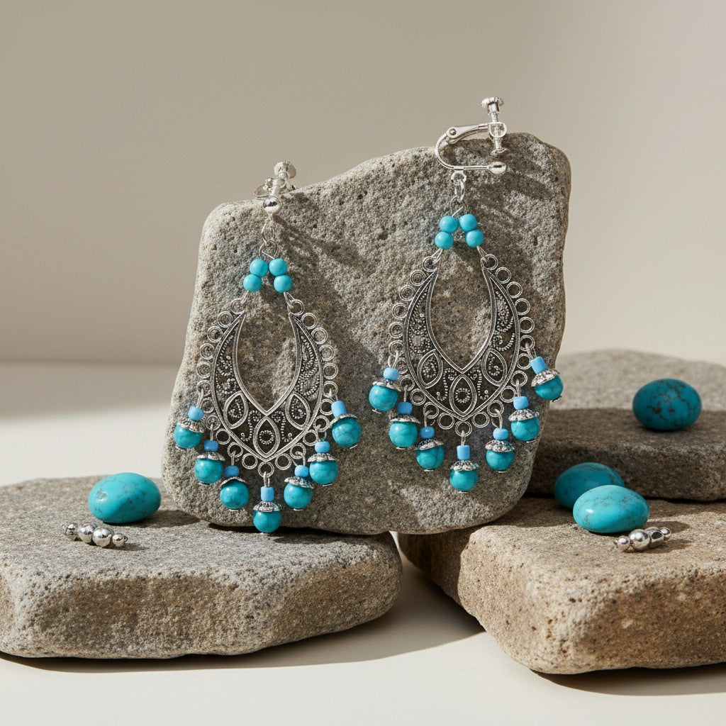 Elevate your accessory game with these striking clip-on dangle earrings, featuring an elegant silver cutout design paired with vibrant turquoise beads. At 3 1/4" long, they make a bold statement while remaining comfortable for all-day wear. The no-piercing clip mechanism offers versatility for anyone seeking polished style without commitment. Perfect for adding a pop of color to any outfit, these earrings blend contemporary design with timeless appeal.