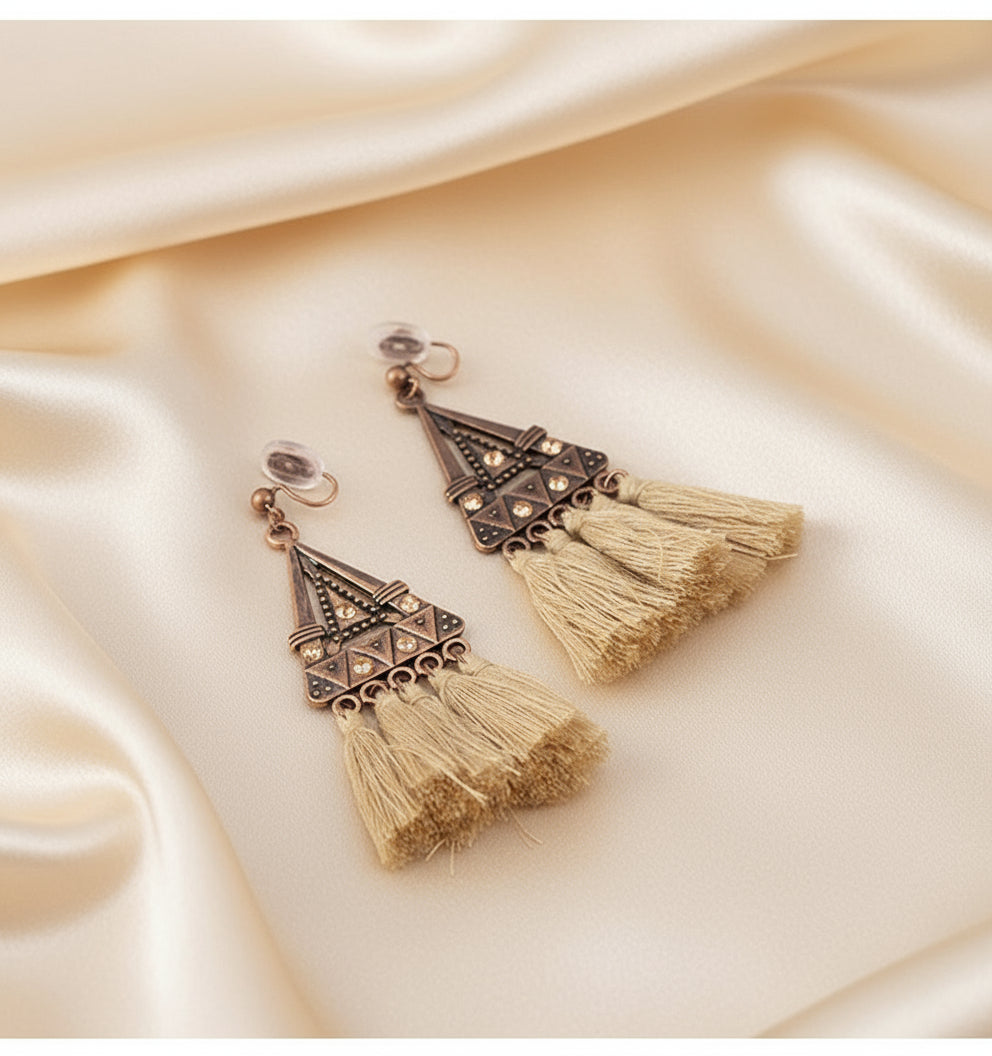 Make a striking impression with these extended 3 1/4" clip-on earrings that combine bohemian charm with everyday wearability. The copper coil design paired with rich brown string and stones creates an artisanal aesthetic that works beautifully with any style. Engineered with comfort-fit technology, these dangling beauties won't weigh you down, making them ideal for all-day wear.