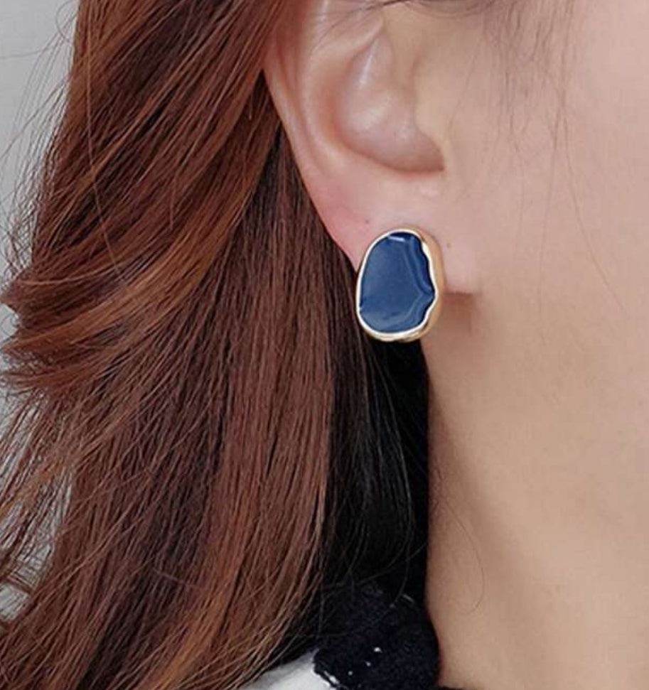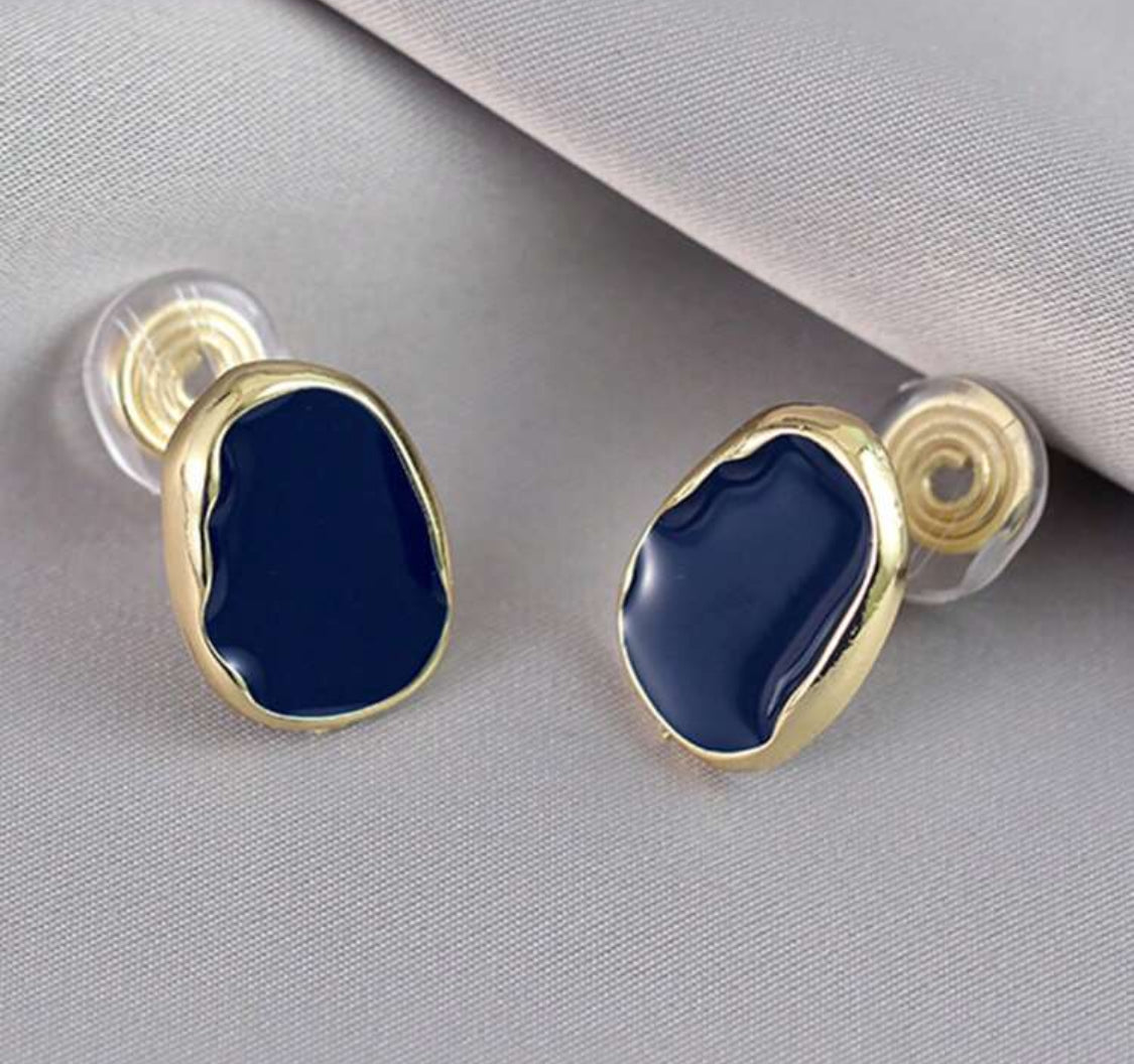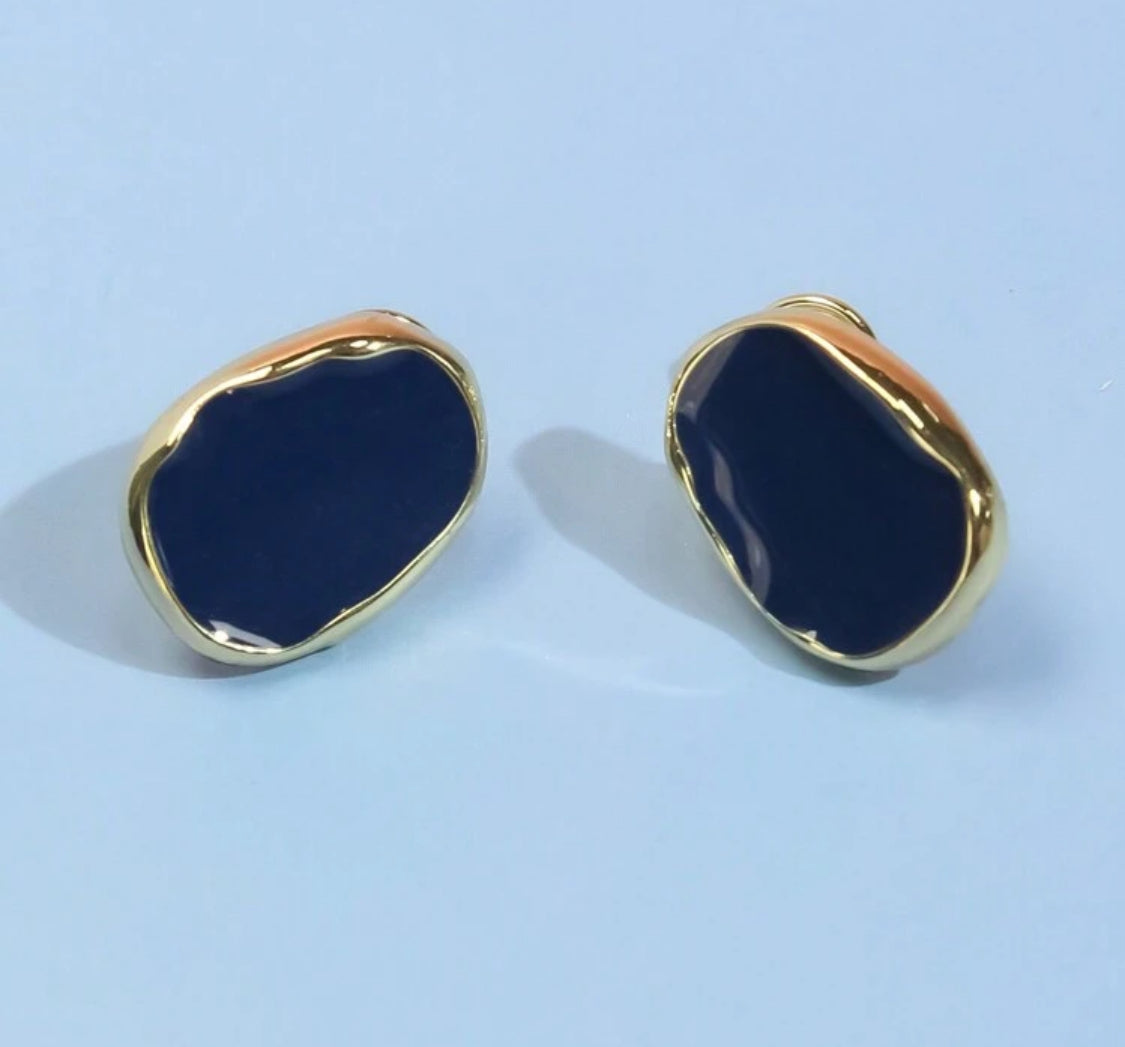 These clip-on earrings feature a unique 3/4" odd-shaped button design in elegant gold and blue tones. Crafted for comfort, they offer a secure fit without the need for pierced ears, making them perfect for all-day wear. Add a distinctive touch to your look with these stylish and easy-to-wear accessories.