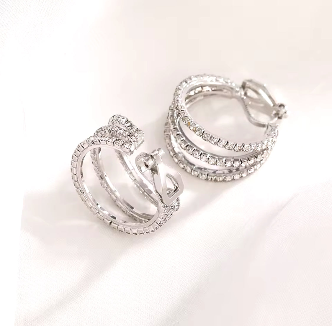 Clip on 3/4" silver and clear stone cutout wide hoop earrings