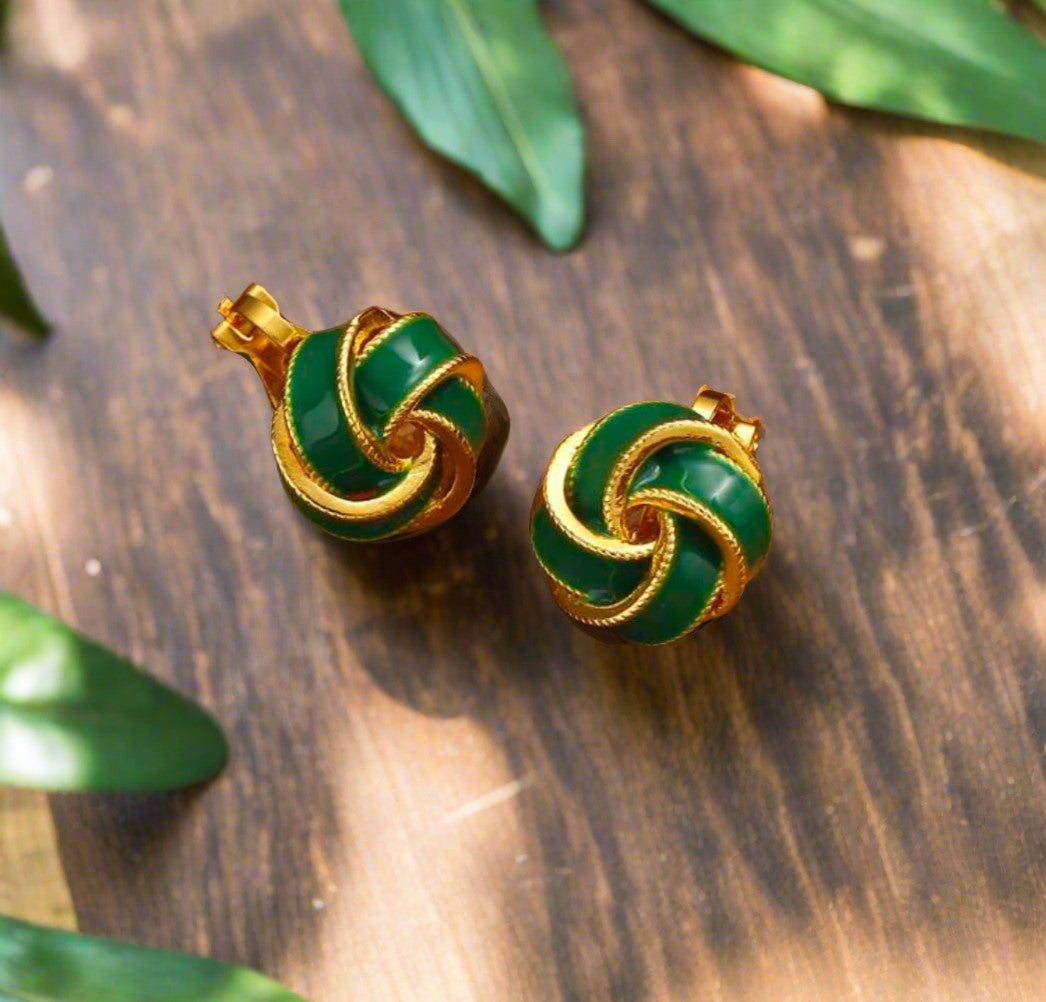 Elevate your style effortlessly with these 3/4" clip-on earrings featuring a sleek green knot design framed by a textured gold edge. Perfect for those without pierced ears, they offer a comfortable fit while adding a touch of sophistication to any outfit. Their compact size makes them ideal for both everyday wear and special occasions, combining classic elegance with modern convenience.