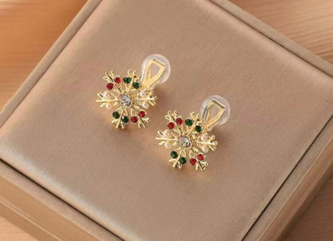 Add festive charm to any outfit with these 1" clip-on snowflake button earrings featuring gold, red, green, clear stones and pearl accents. Perfect for those without pierced ears, they offer an easy, comfortable way to celebrate the season in style. Their vibrant colors and elegant design make them ideal for holiday parties or everyday winter wear.