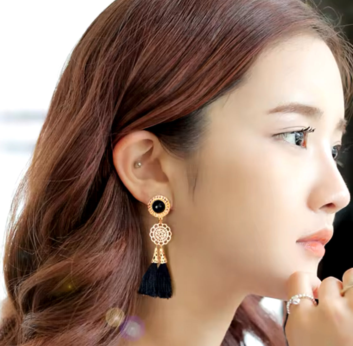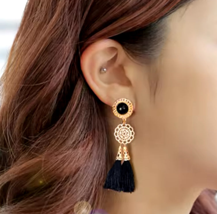 Elevate your style with these 4-inch clip-on double tassel earrings featuring elegant gold and black strings. Their lightweight design ensures comfortable wear all day, while the striking length adds a bold, sophisticated touch to any outfit. Perfect for those who want statement jewelry without the commitment of pierced ears.