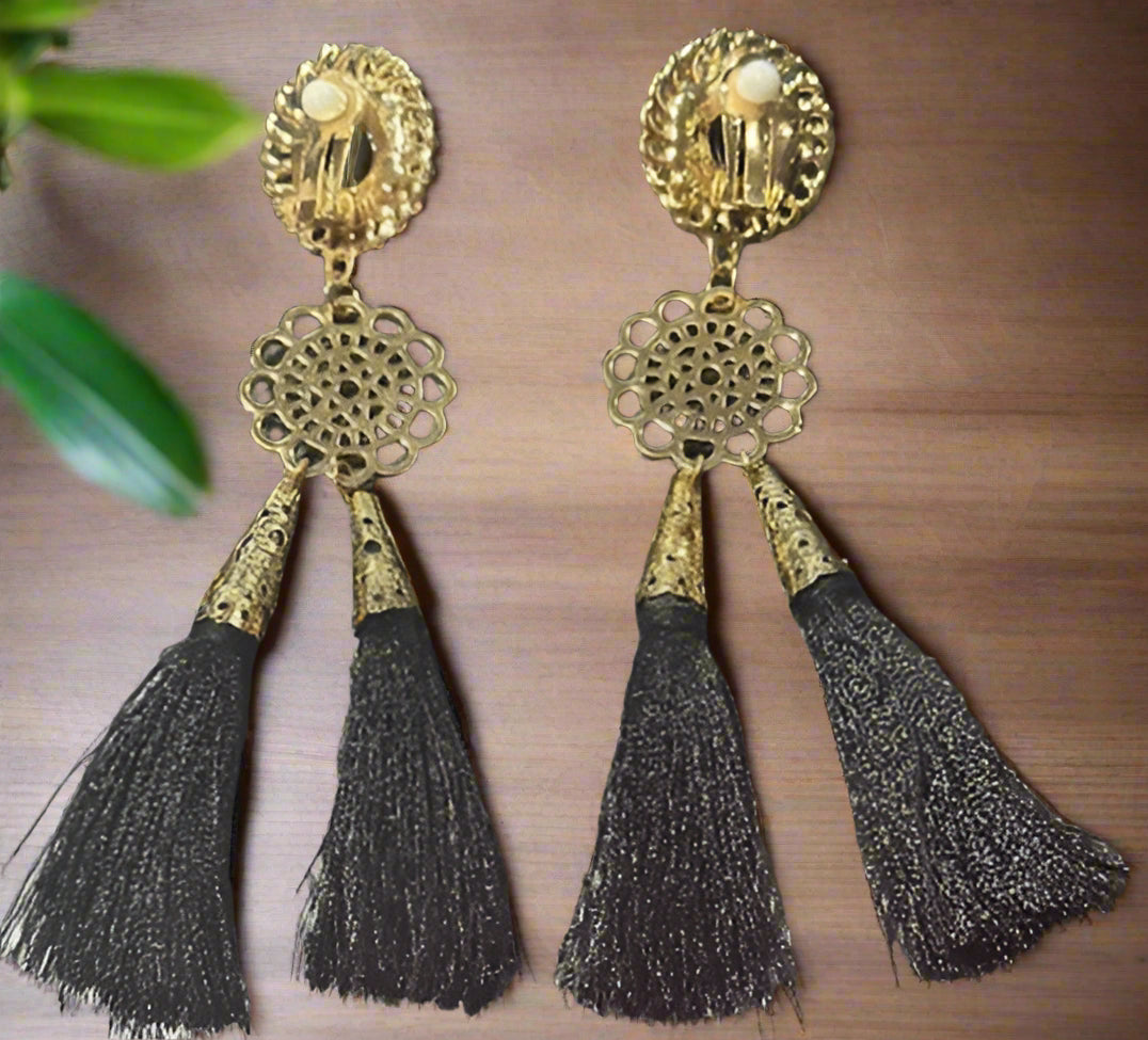 Clip on 4" Xlong gold and black string tassel dangle earrings