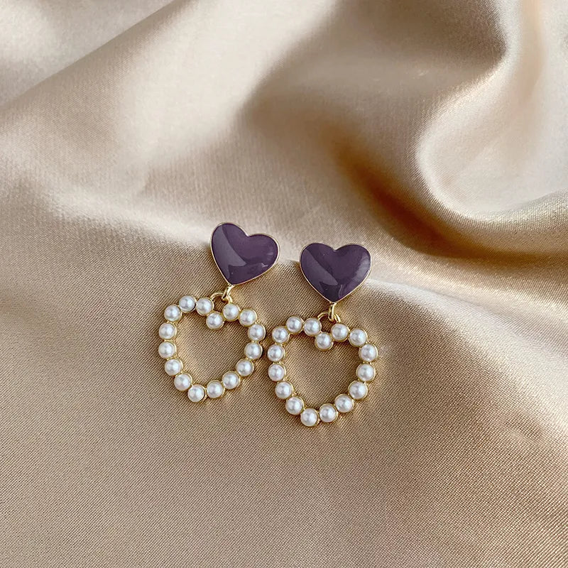 Clip on 1 1/2" gold, purple and white pearl dangle heart earrings