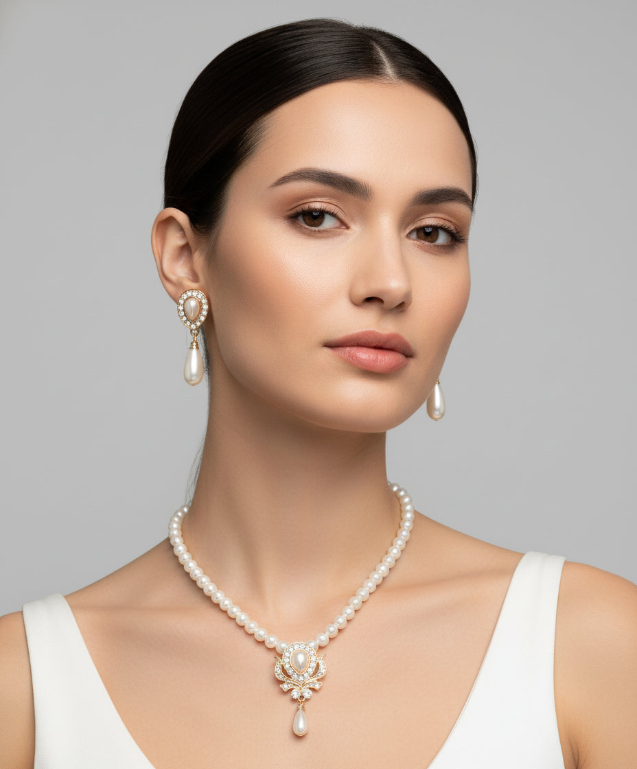 Clip on gold, pearl and clear stone dangle pearl necklace set