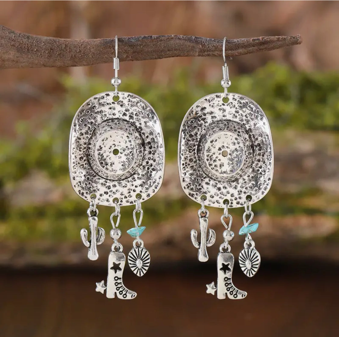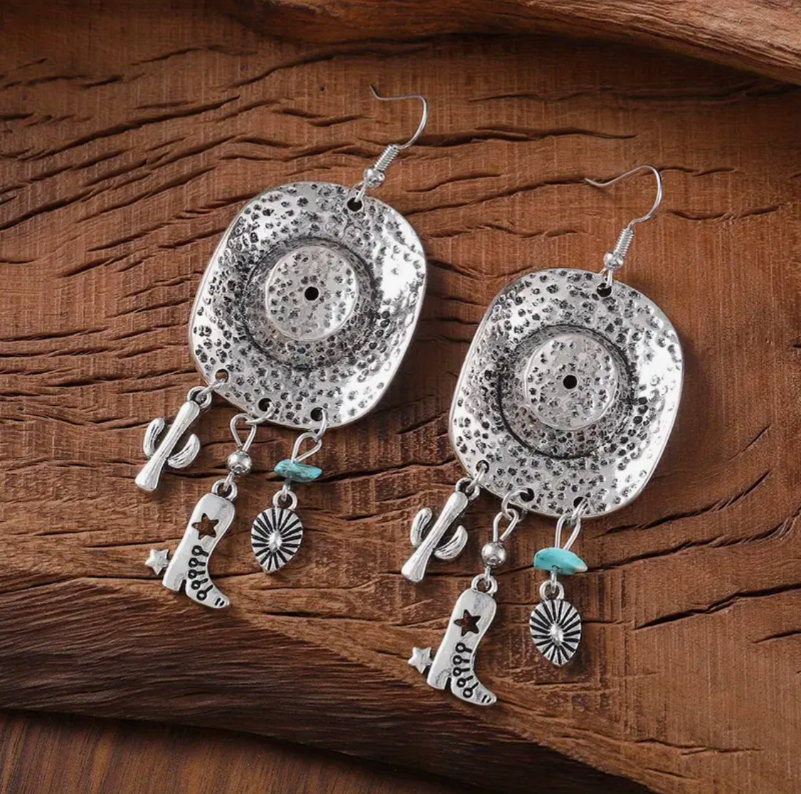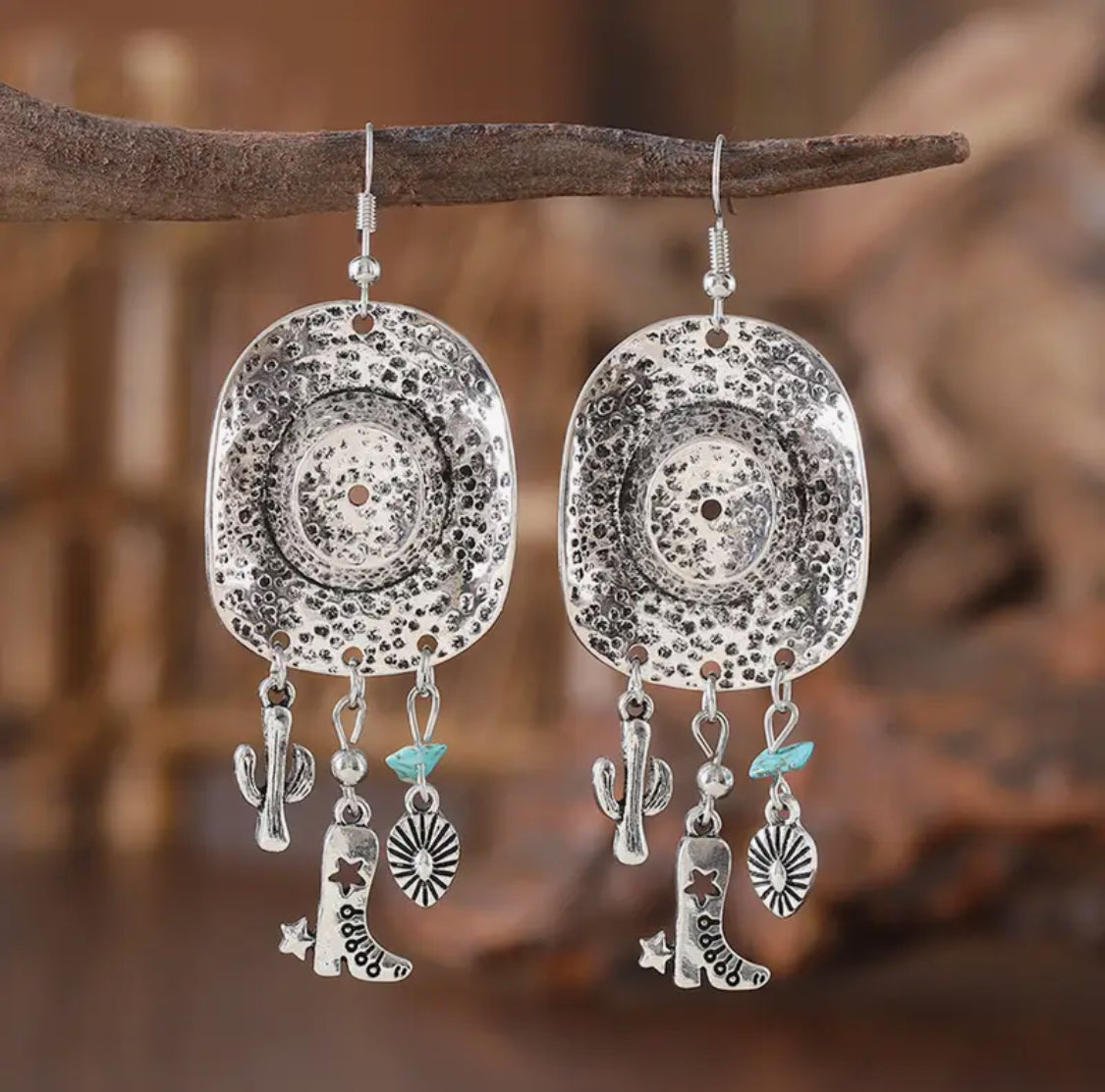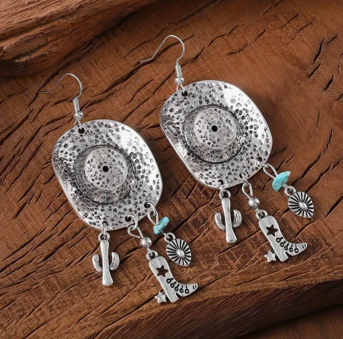 These Western-style earrings feature a 3 1/4" silver dangle design accented with vibrant turquoise stones and charming hat-shaped boot, cactus, and teardrop charms. Perfect for adding a touch of rustic elegance to any outfit, they combine classic craftsmanship with eye-catching detail. Ideal for those who appreciate unique accessories that stand out with authentic Western flair.