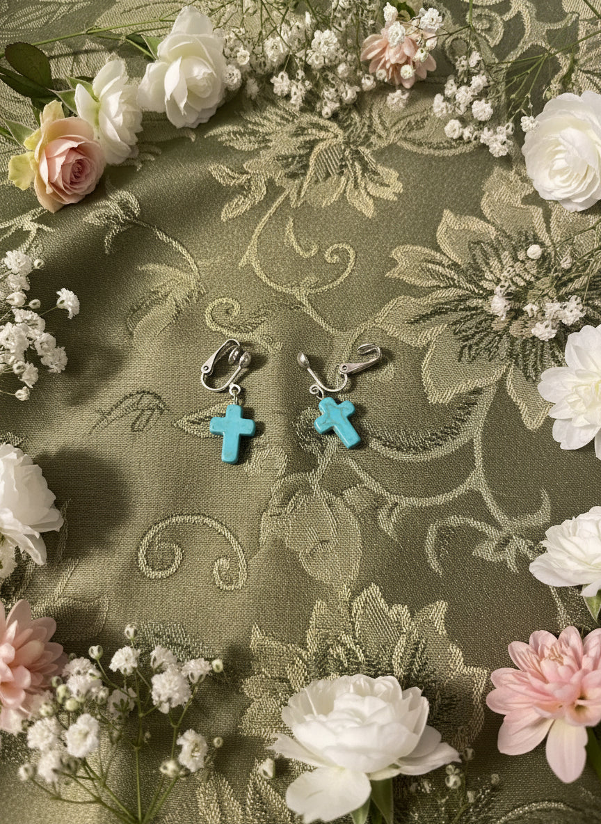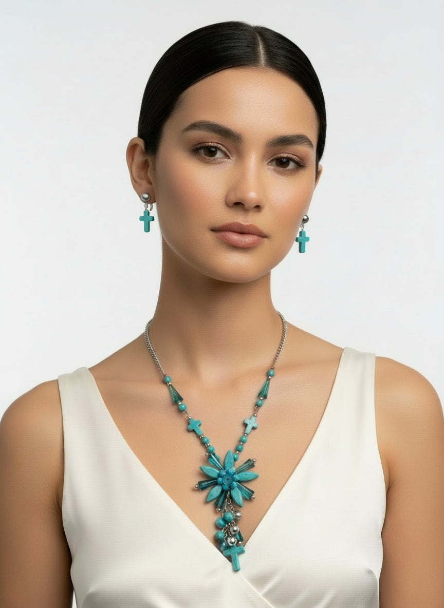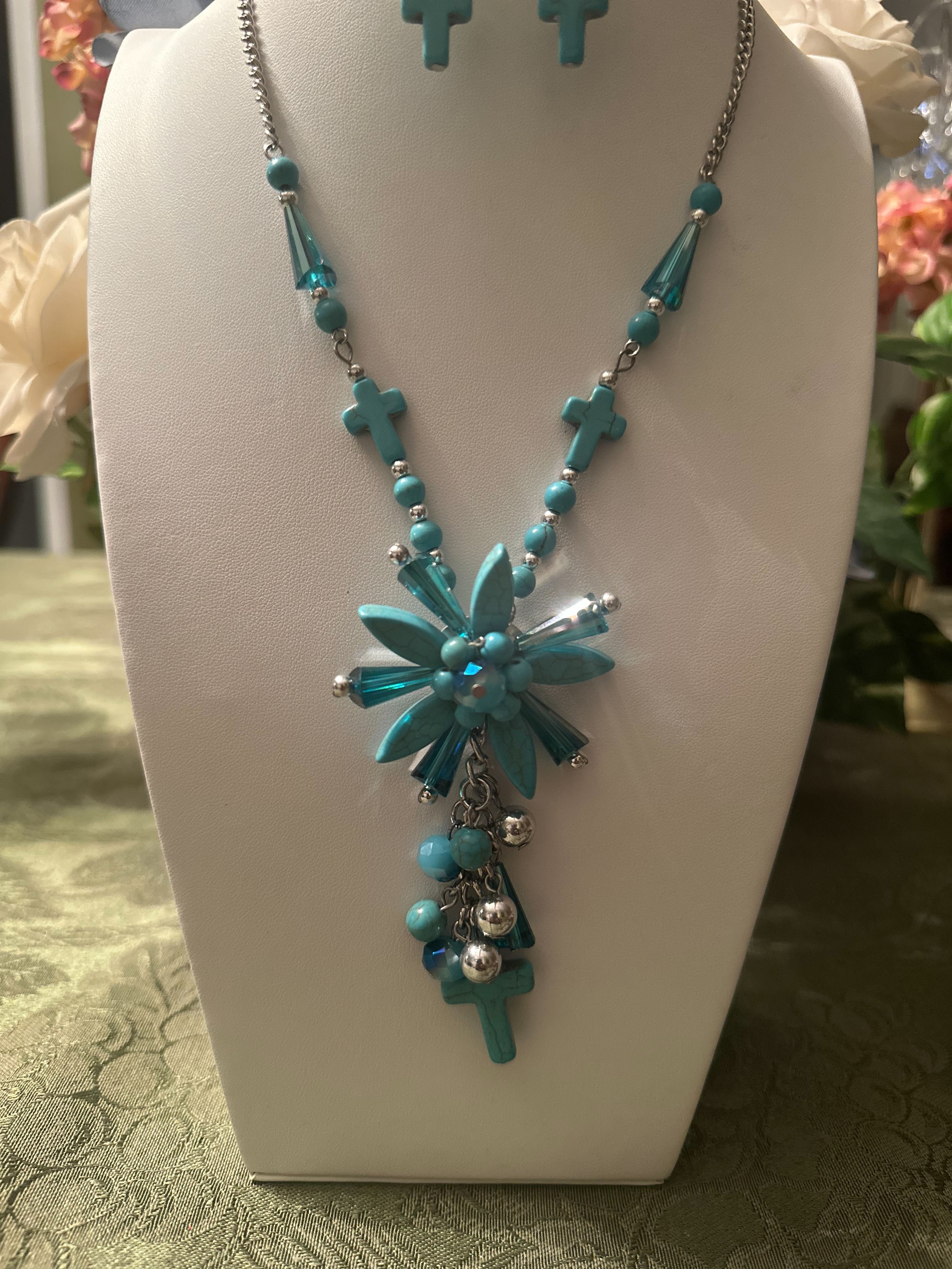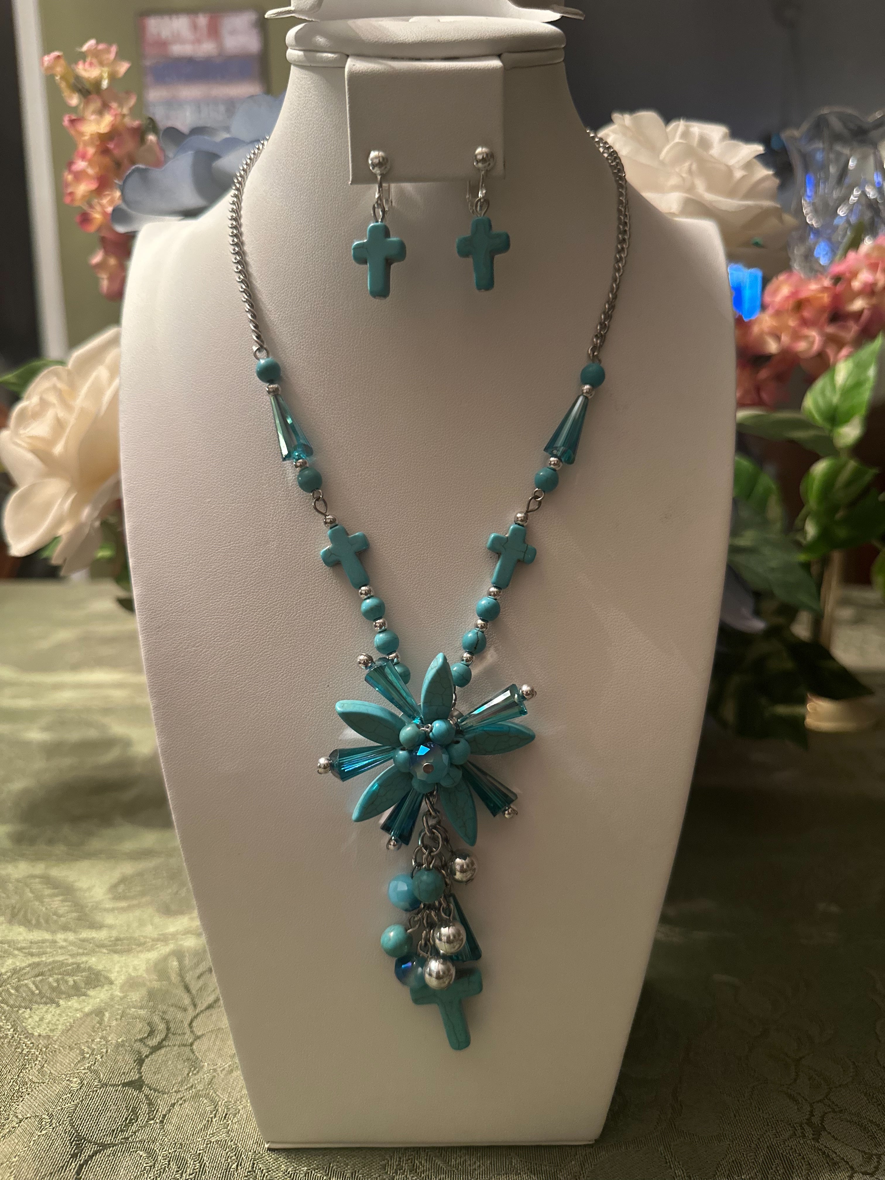 Clip on silver chain turquoise flower and cross necklace and earring set. The necklace has clear and silver beads.