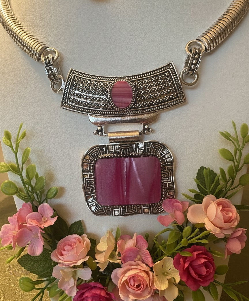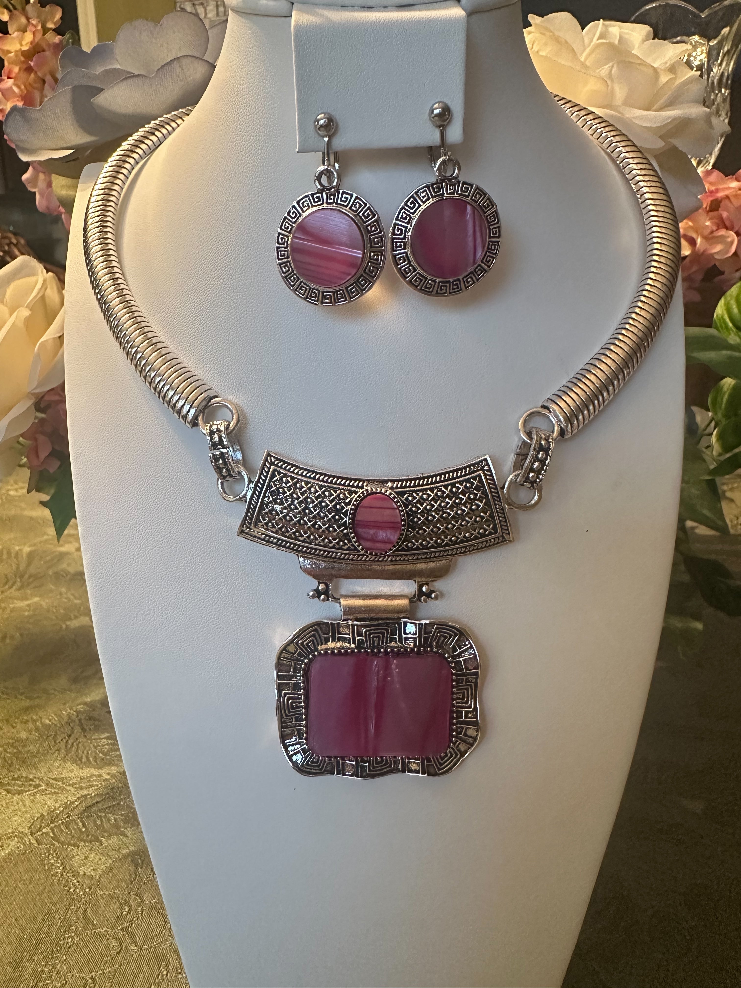 Clip on silver and pink shell necklace and earring set
