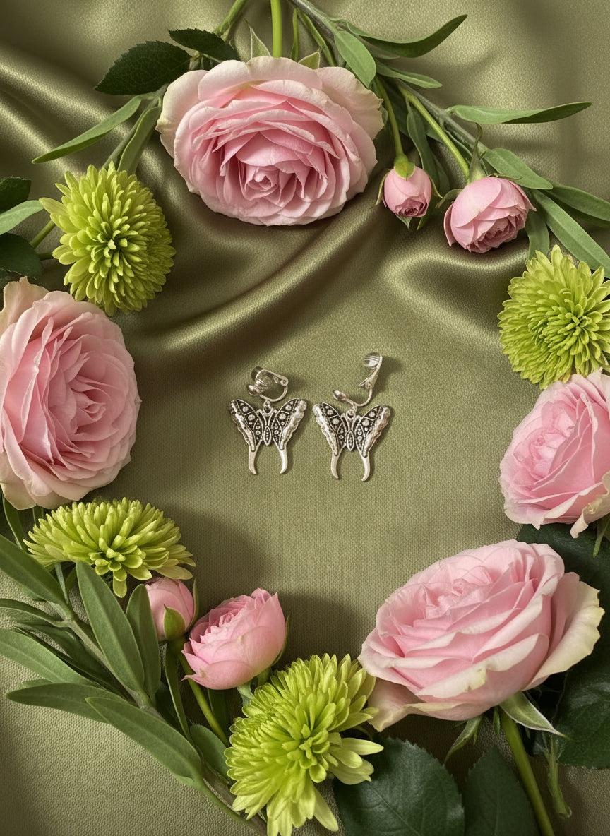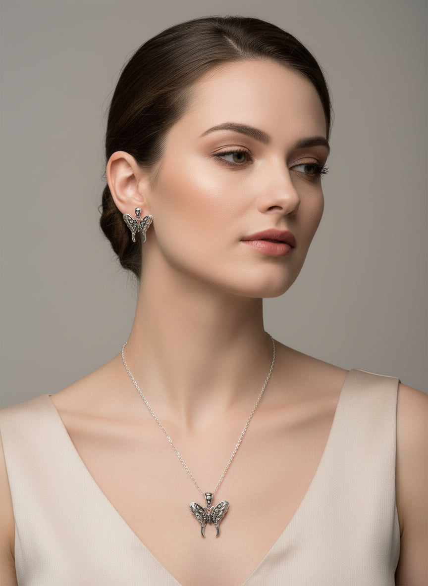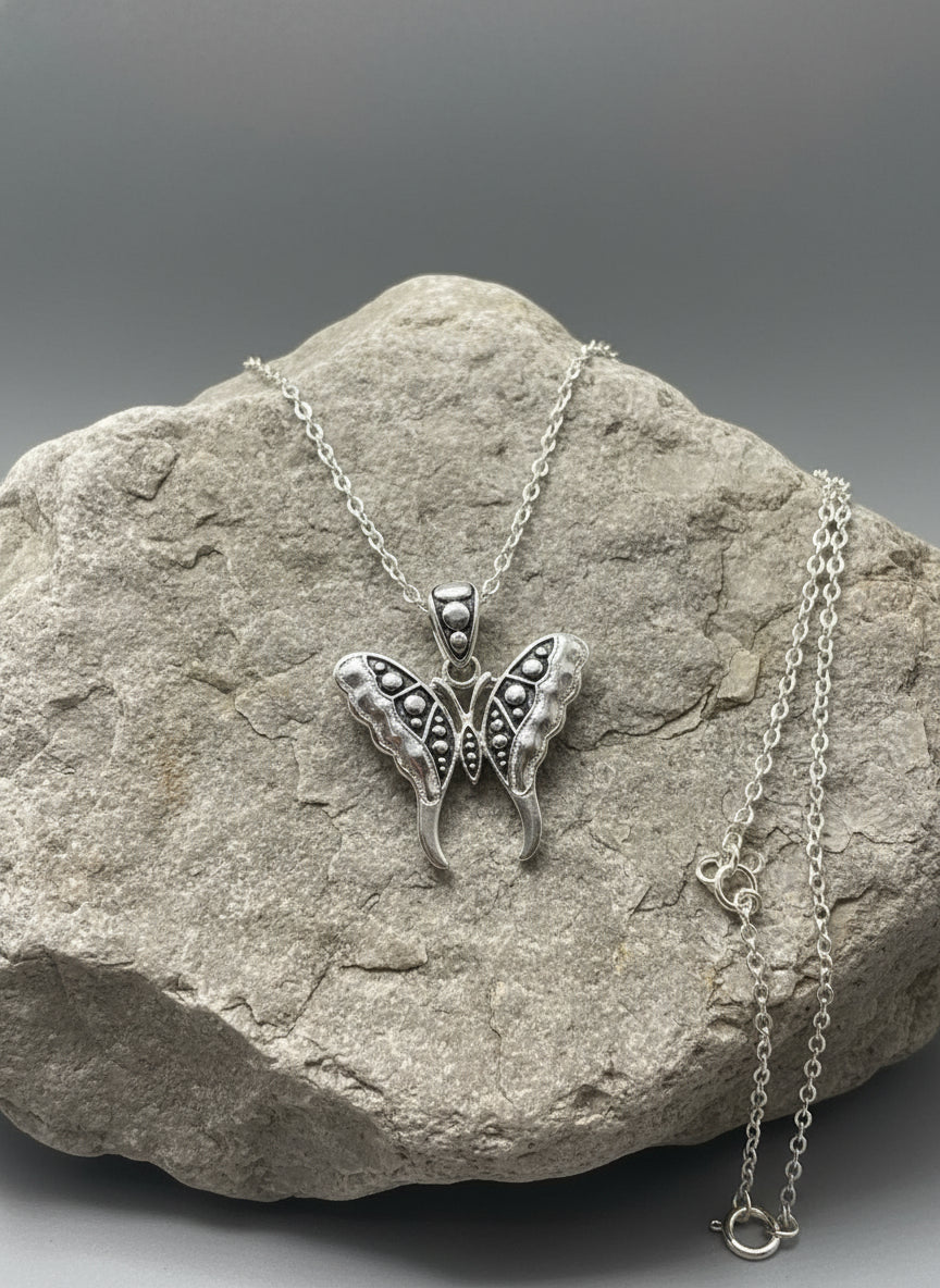 Discover timeless elegance with this captivating clip-on set featuring a delicate silver chain and graceful butterfly pendant. The silver and black butterfly symbolizes transformation and beauty, making this more than just jewelry—it's a meaningful accessory that resonates with your personal style. The clip-on mechanism offers flexibility without compromise, allowing you to wear it whenever inspiration strikes.