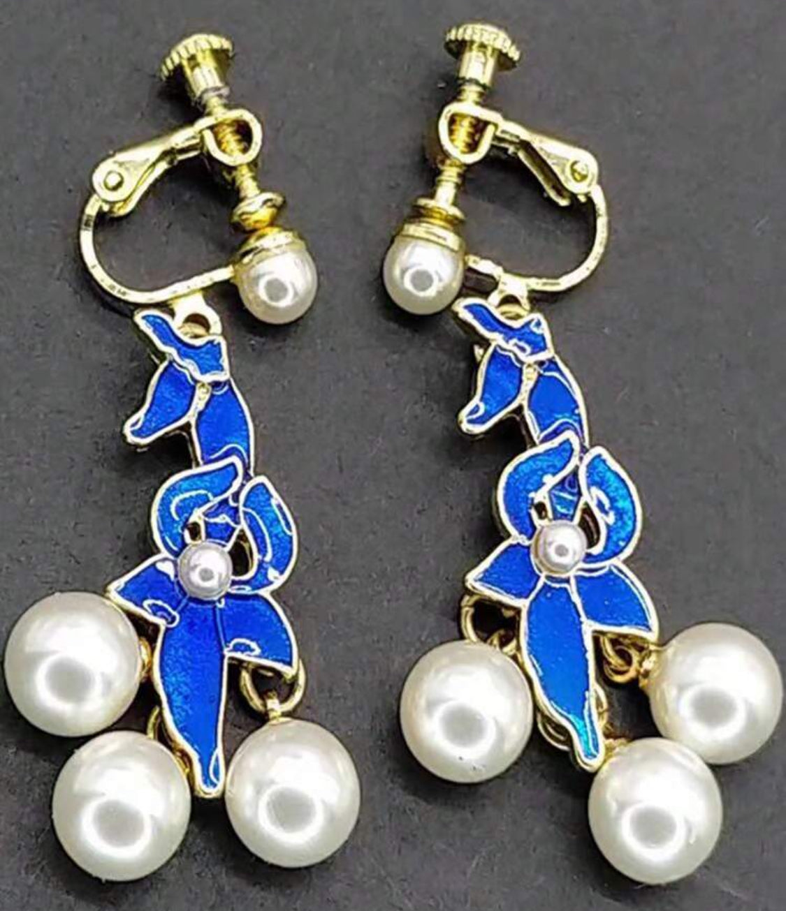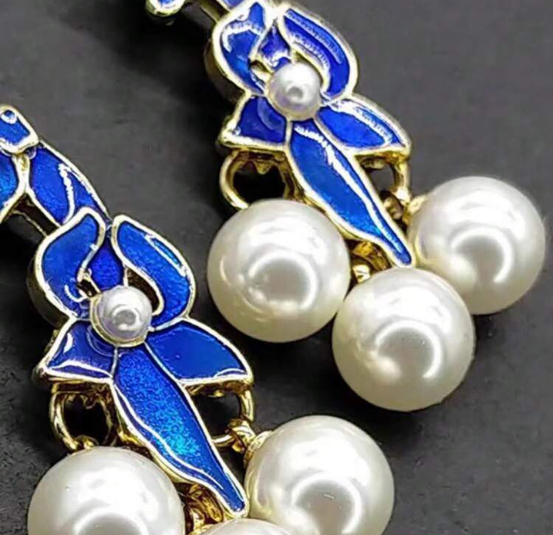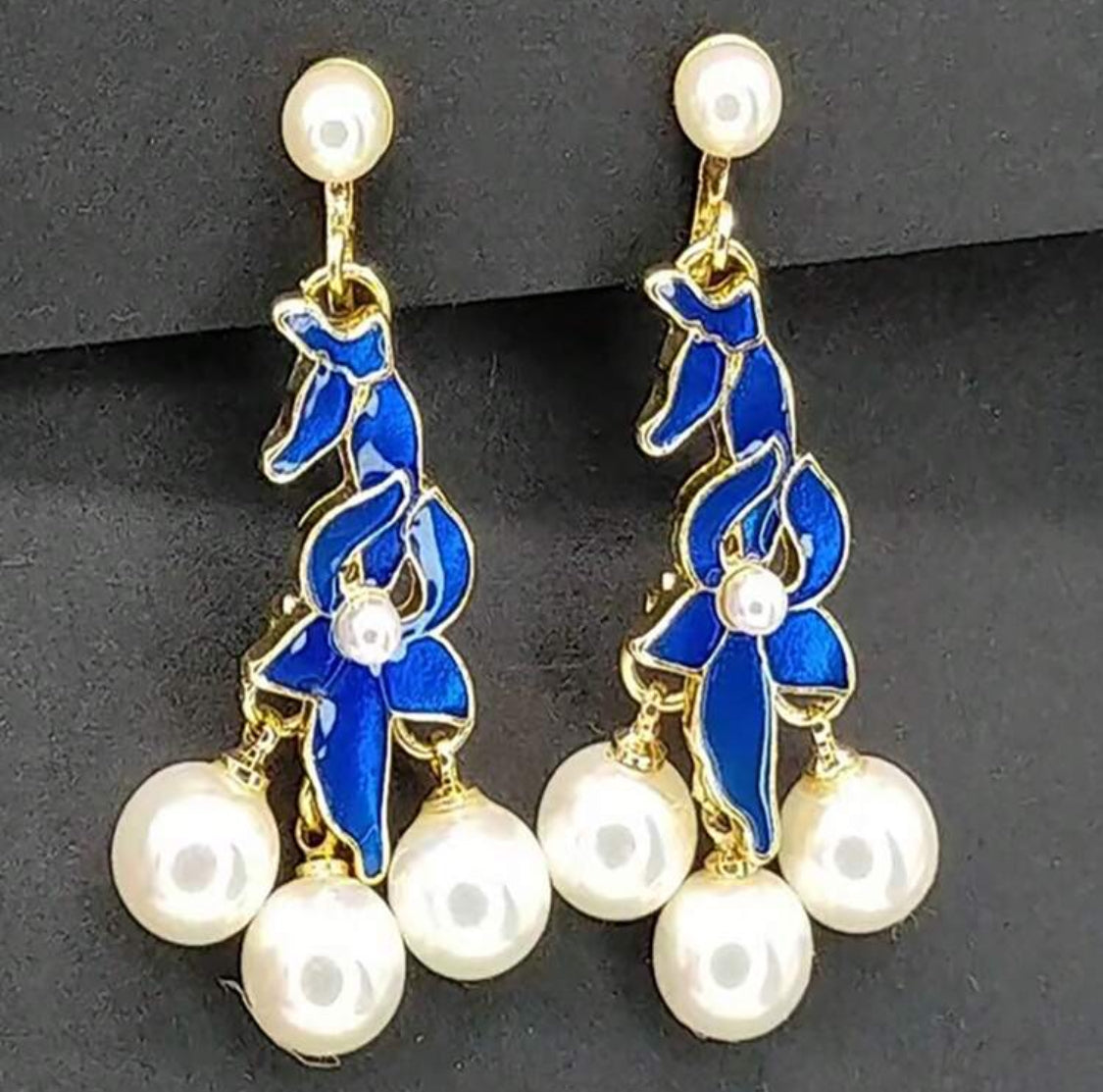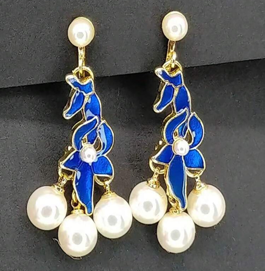 Clip on 1 3/4" gold, blue flower earrings with dangle white pearls