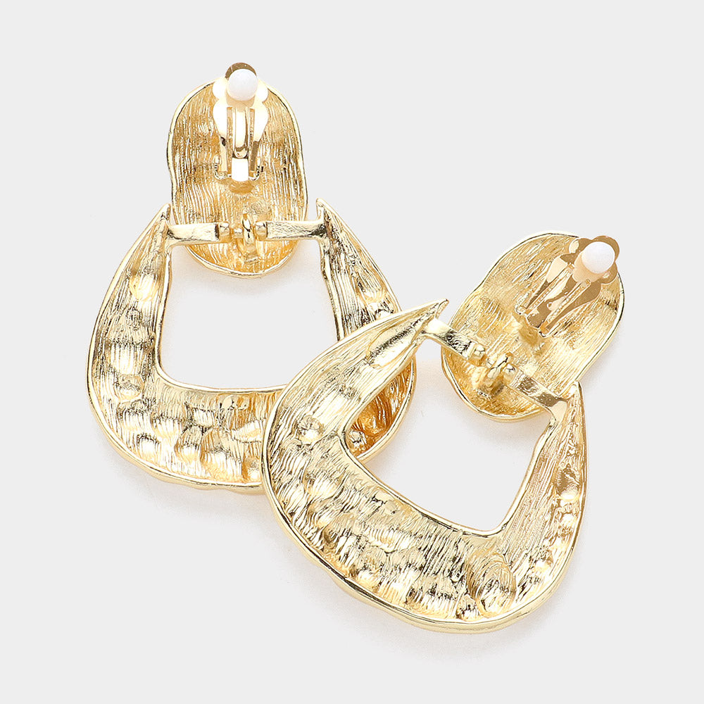 Make a bold statement with these 2 1/4" large gold hammered dangle door knob clip-on earrings. Their unique hammered texture catches the light beautifully, adding a touch of artisanal charm to any outfit. Designed for comfort without the need for pierced ears, these earrings offer an easy way to elevate your style with a distinctive, eye-catching accessory. Perfect for those who want standout jewelry that’s both stylish and effortless to wear.