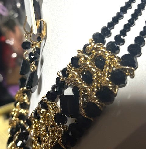Elevate your style effortlessly with this clip-on gold chain and black bead wide necklace and earring set. Designed for comfort and elegance, the clip-on feature ensures easy wear without the need for pierced ears. The striking combination of gold tones and black beads adds a bold, sophisticated touch to any outfit, making it perfect for both casual and formal occasions. Make a statement with this versatile set that blends classic charm with modern convenience.