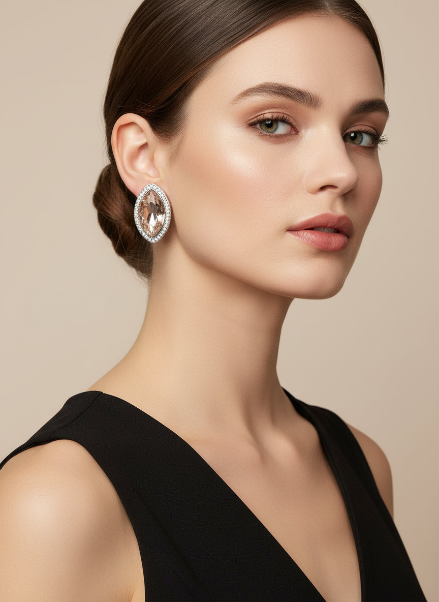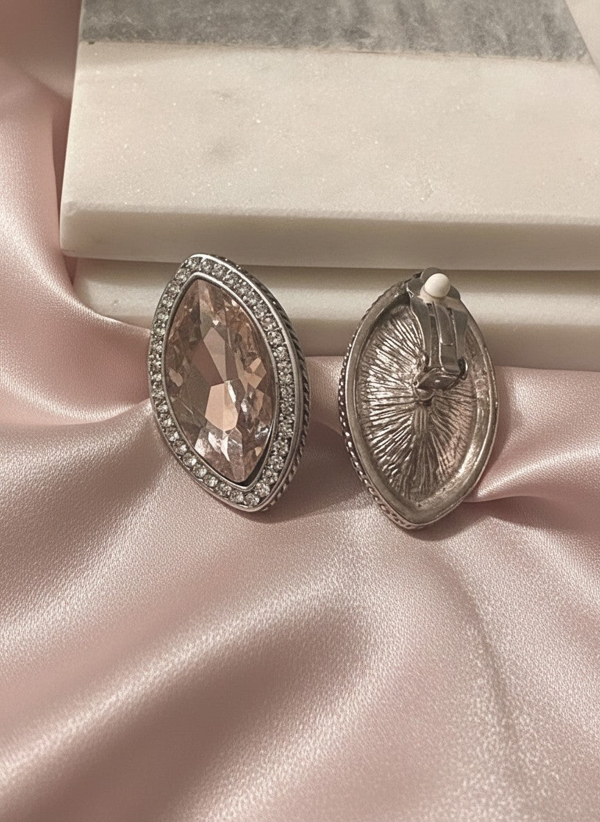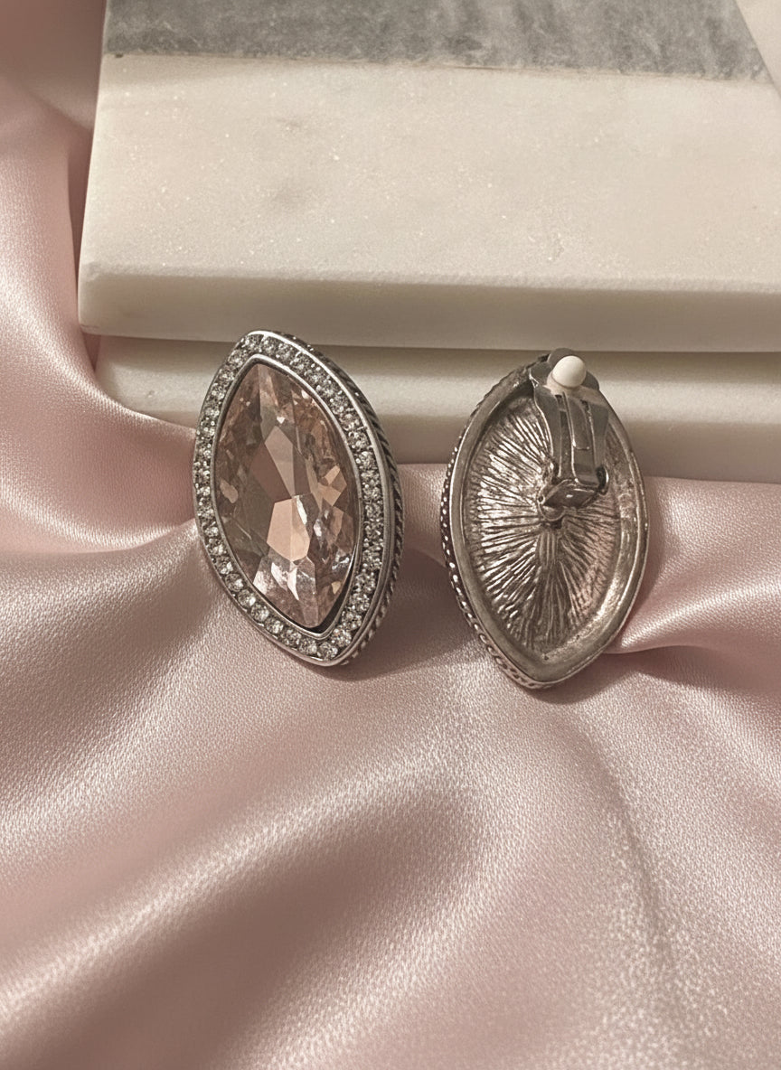 Clip on 1 3/4" large silver, pink and clear stone pointed edge earrings
