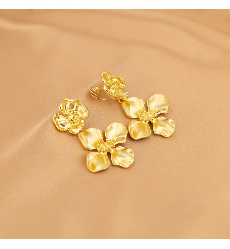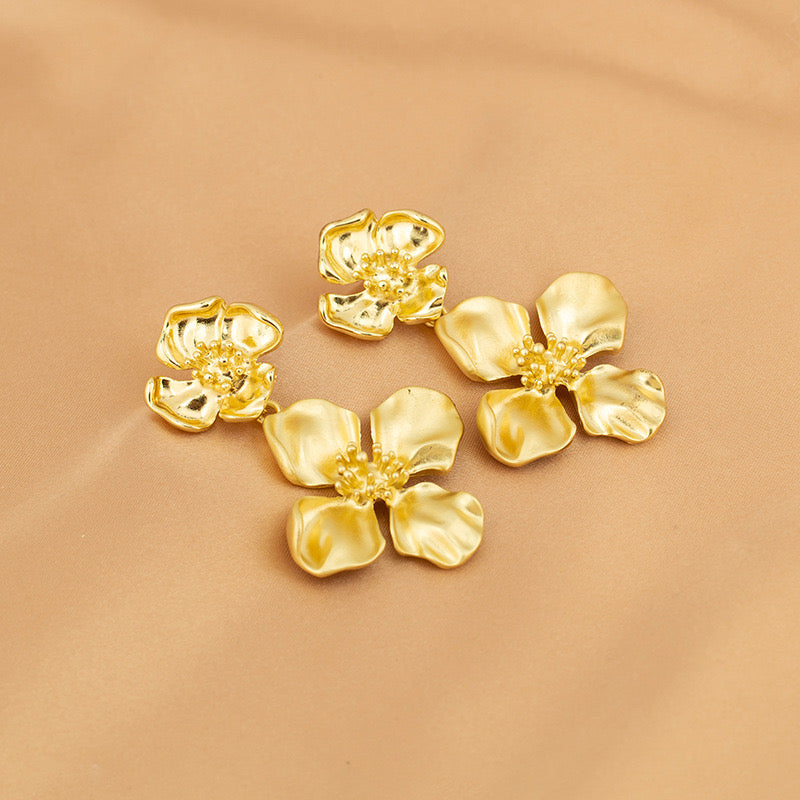 Command the room with these striking double flower dangle earrings that make a bold, sophisticated statement. Measuring 2 3/4" long, they offer dramatic length that draws admiration without sacrificing wearability. The matte gold finish delivers understated luxury with a contemporary edge, while the dual floral design adds dimension and visual interest.