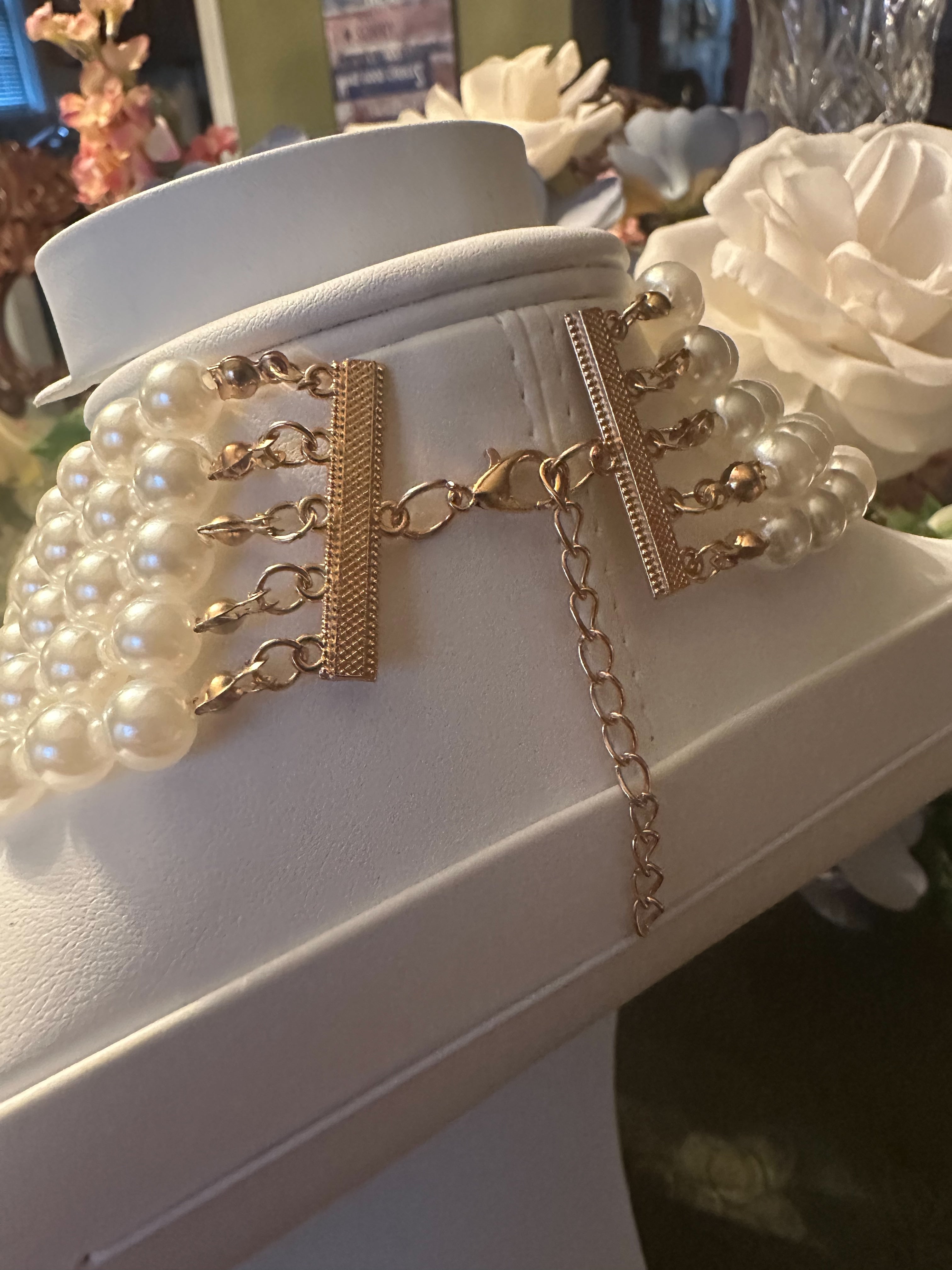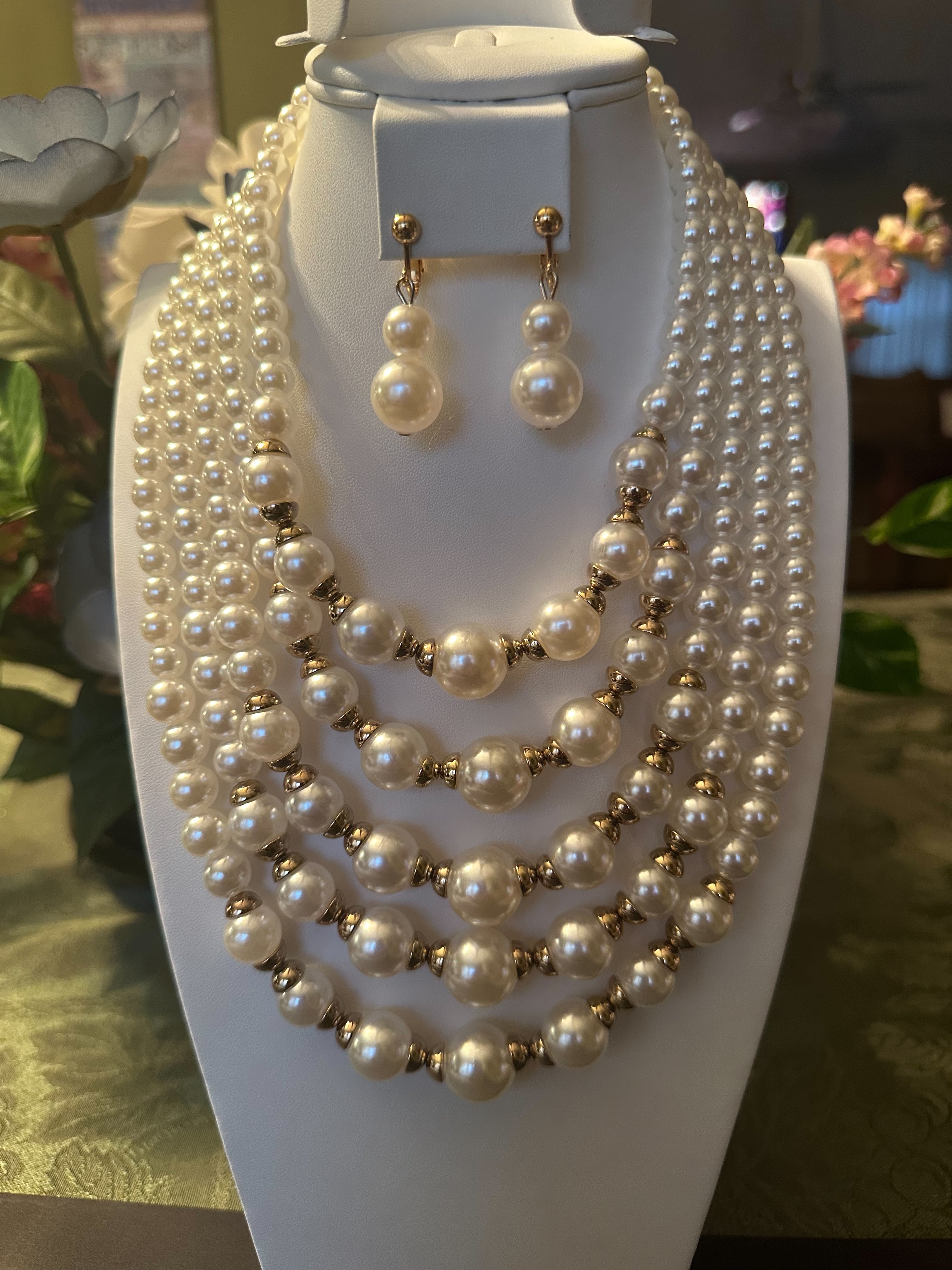 Elevate your accessory game with this luxurious five-strand graduated clip-on necklace and earring set featuring gleaming gold and creamy cream pearls. The multi-strand design creates dramatic visual impact, perfect for commanding attention at any event. Crafted for comfort, the clip-on mechanism means no piercing required—just secure styling that lasts all day.