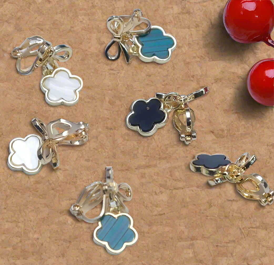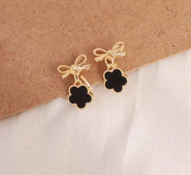 Add a touch of elegance to any outfit with our clip-on 1" gold bow earrings. The dangle round edge black flower adds a unique and stylish flair. Enjoy the convenience and comfort of the clip-on design while making a statement. Elevate your look with these stunning earrings!