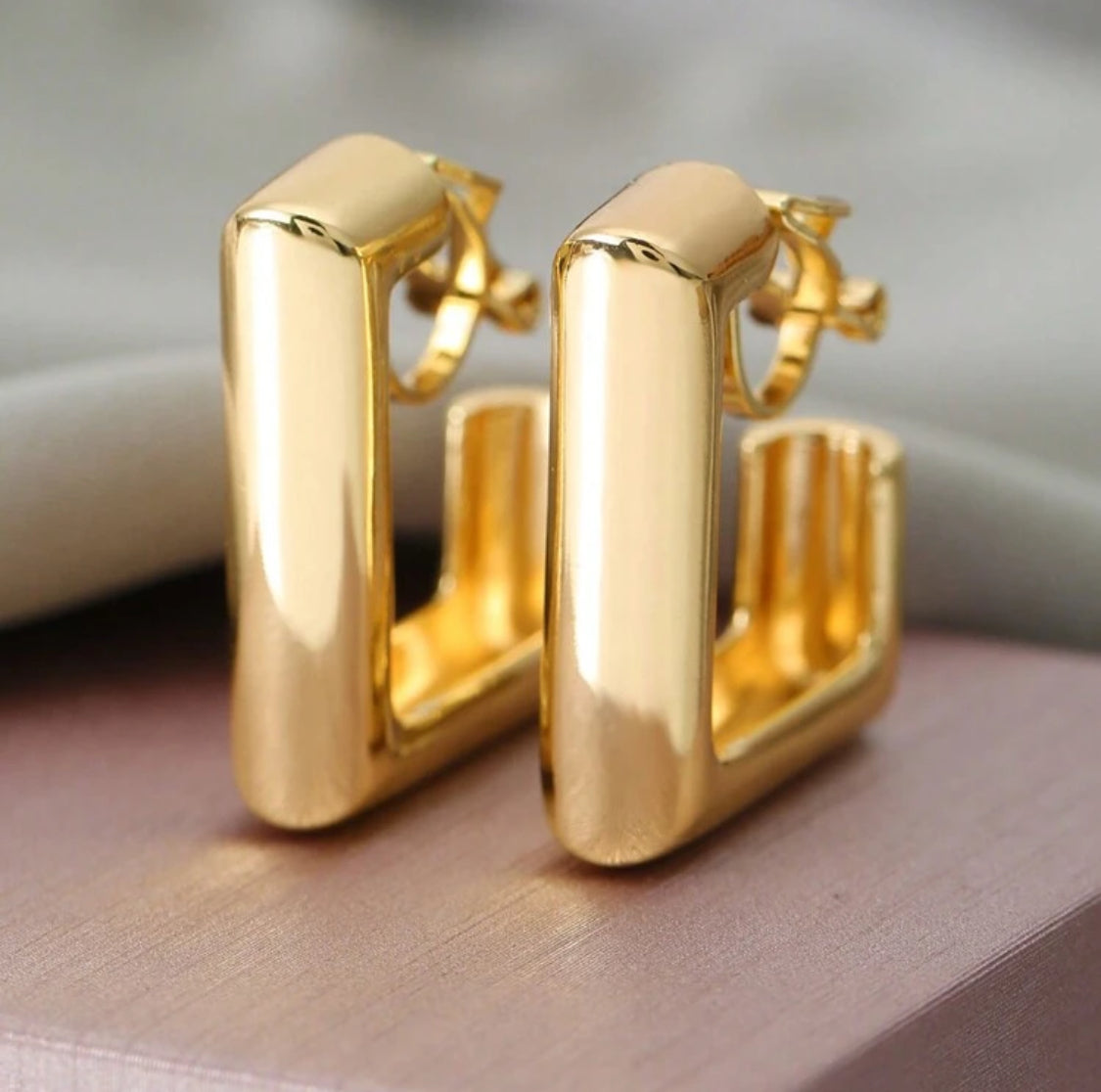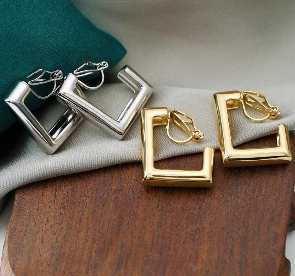 Clip on 1" shiny gold square open back earrings